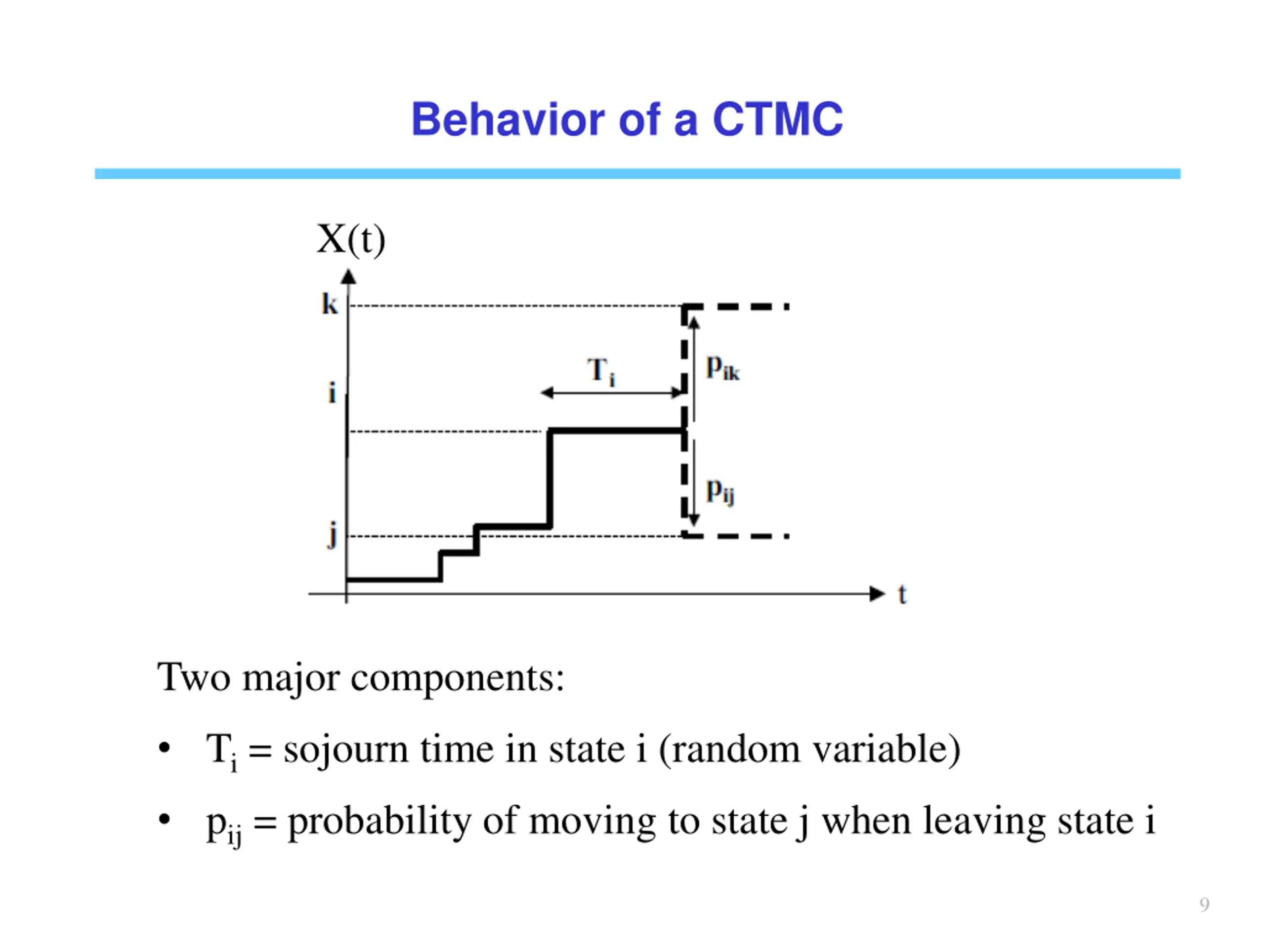 Behavior of a CTMC X(t) Two major components: Ti = sojourn time in state i (random variable) pij = probability of moving to state j when leaving state i 9