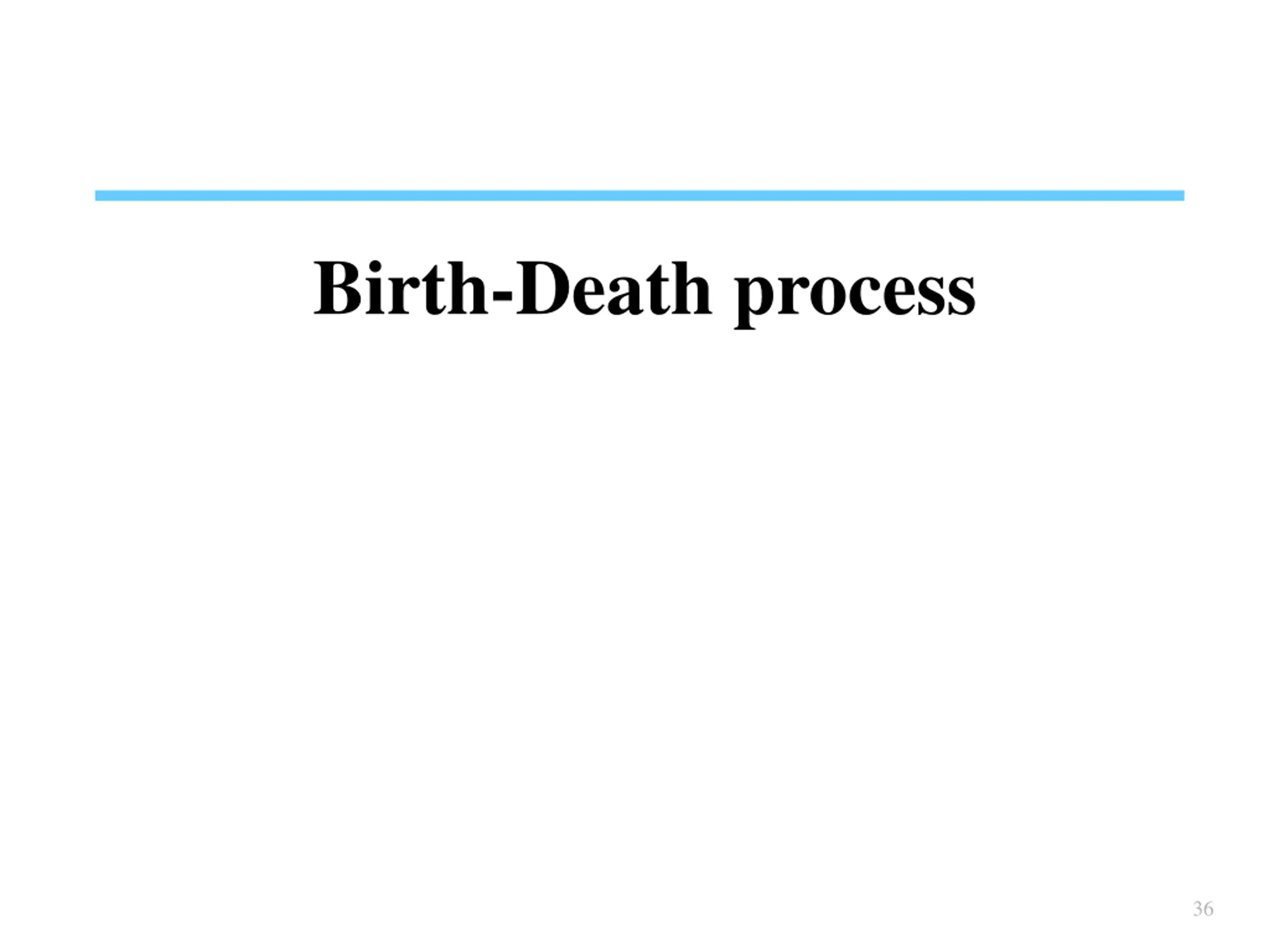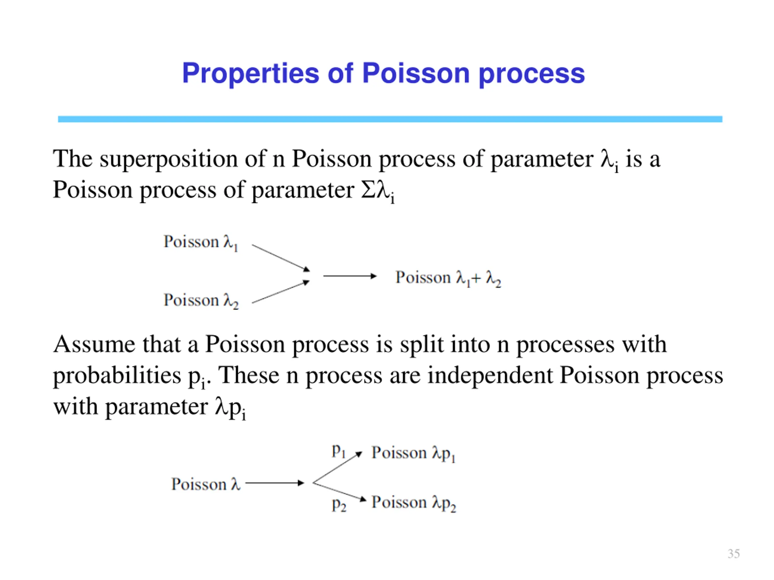 Properties of Poisson process The superposition of n Poisson process of parameter iis a Poisson process of parameter i Assume that a Poisson process is split into n processes with probabilities pi. These n process are independent Poisson process with parameter pi 35