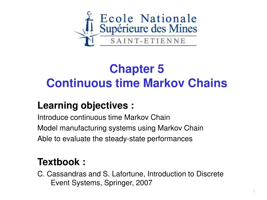 Chapter 5 Continuous time Markov Chains Learning objectives : Introduce continuous time Markov Chain Model manufacturing systems using Markov Chain Able to evaluate the steady-state performances Textbook : C. Cassandras and S. Lafortune, Introduction to Discrete Event Systems, Springer, 2007 1