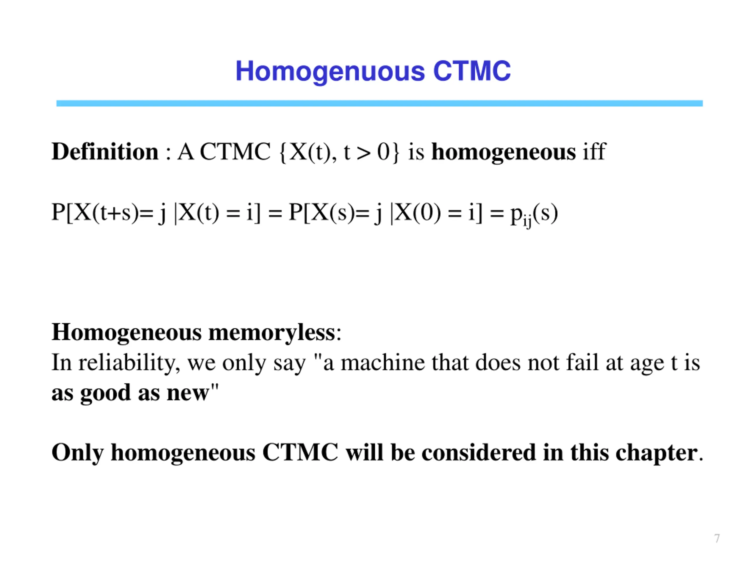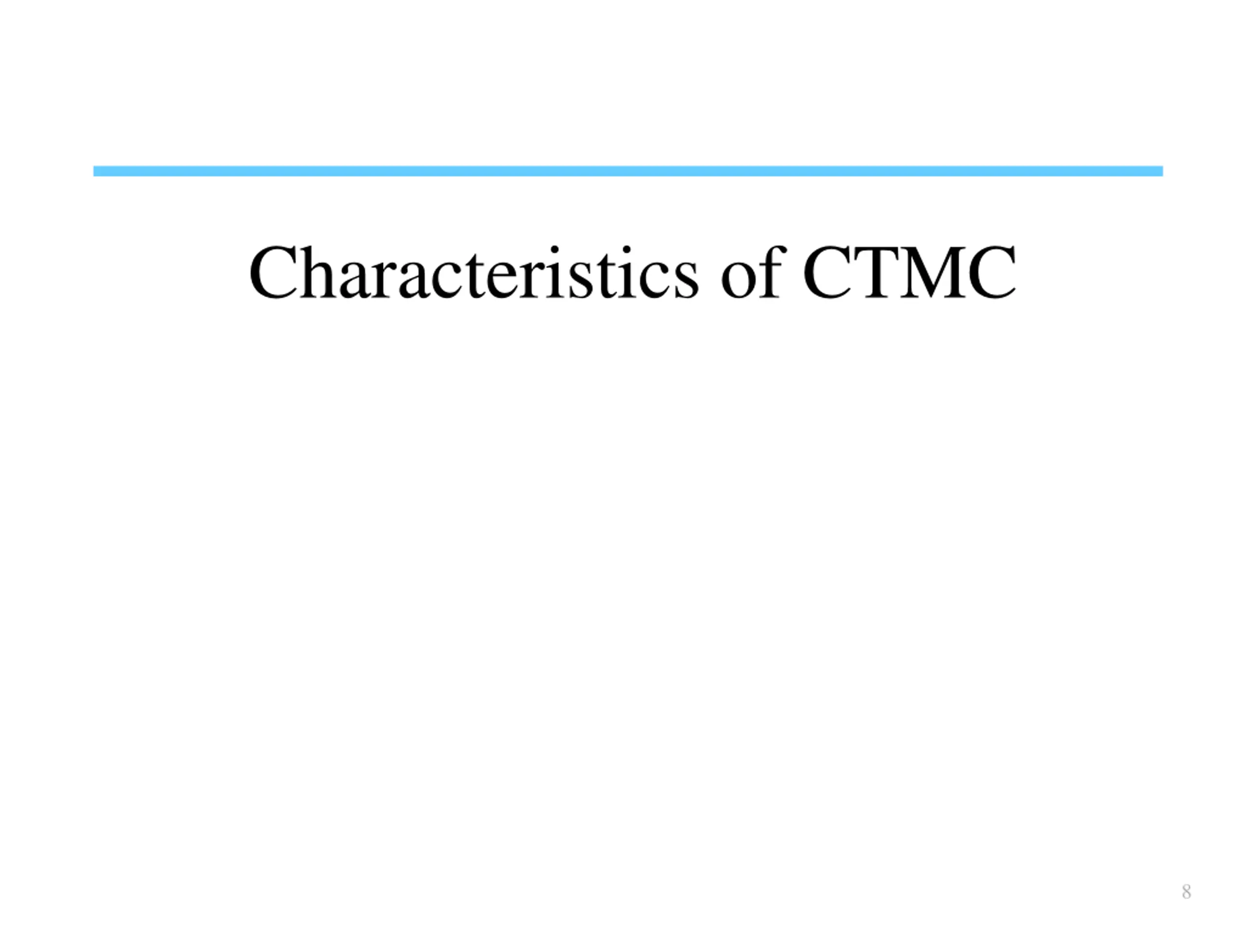 Homogenuous CTMC Definition : A CTMC {X(t), t > 0} is homogeneous iff P[X(t+s)= j X(t) = i] = P[X(s)= j X(0) = i] = pij(s) Homogeneous memoryless: In reliability, we only say "a machine that does not fail at age t is as good as new" Only homogeneous CTMC will be considered in this chapter. 7
