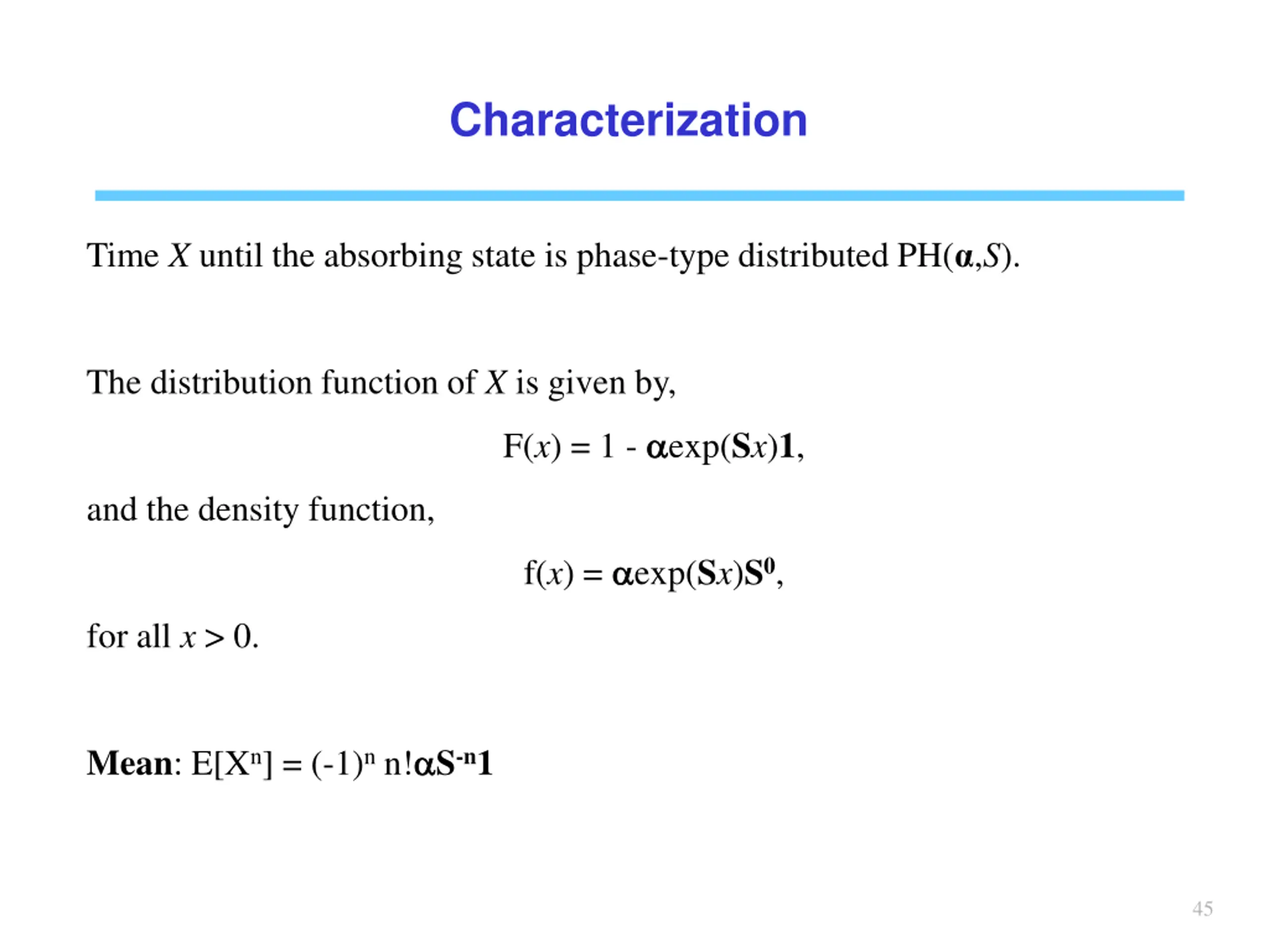 Characterization Time X until the absorbing state is phase-type distributed PH( ,S). The distribution function of X is given by, F(x) = 1 - exp(Sx)1, and the density function, f(x) = exp(Sx)S0, for all x > 0. Mean: E[Xn] = (-1)n n! S-n1 45