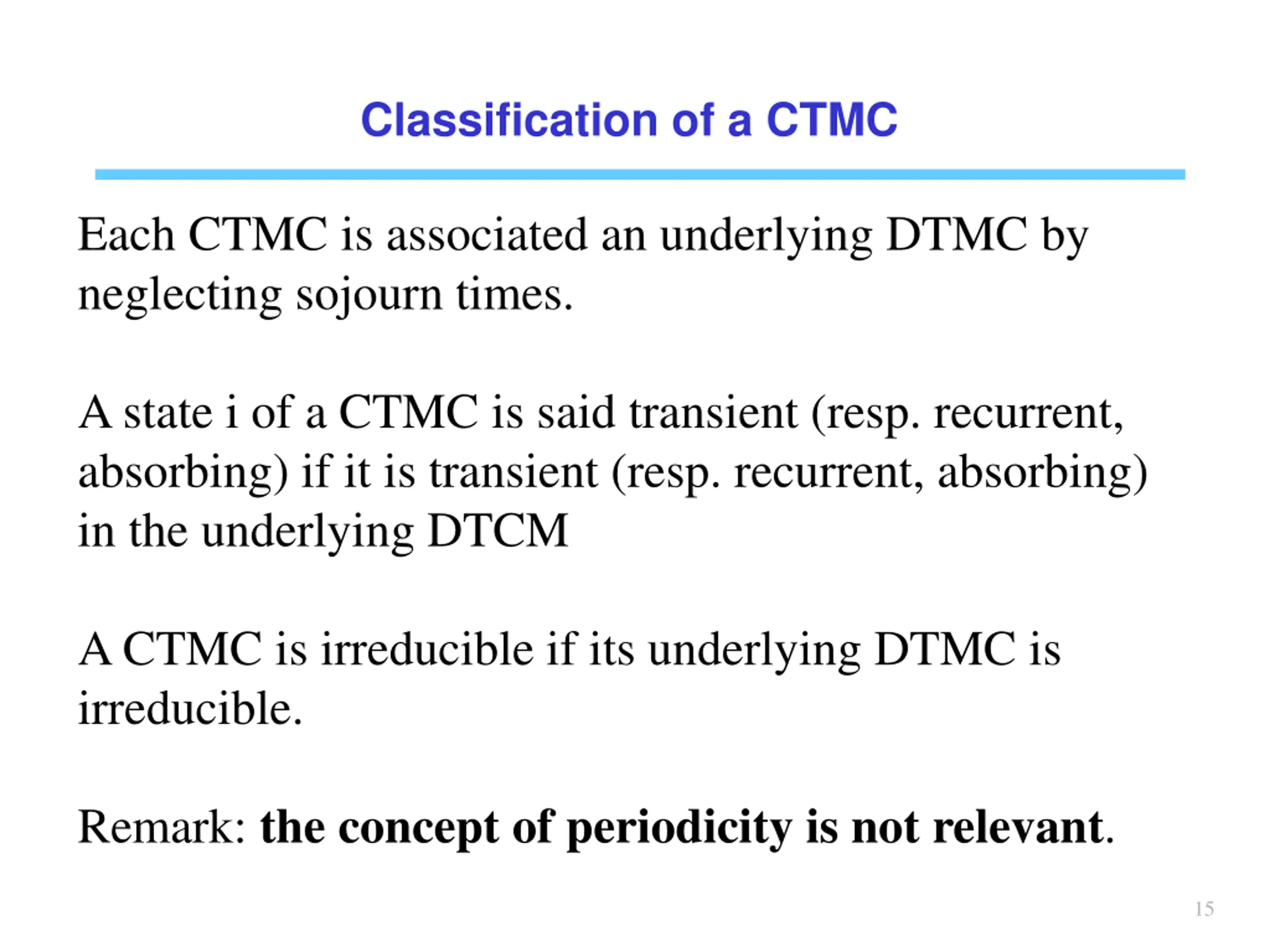 Classification of a CTMC Each CTMC is associated an underlying DTMC by neglecting sojourn times. A state i of a CTMC is said transient (resp. recurrent, absorbing) if it is transient (resp. recurrent, absorbing) in the underlying DTCM A CTMC is irreducible if its underlying DTMC is irreducible. Remark: the concept of periodicity is not relevant. 15