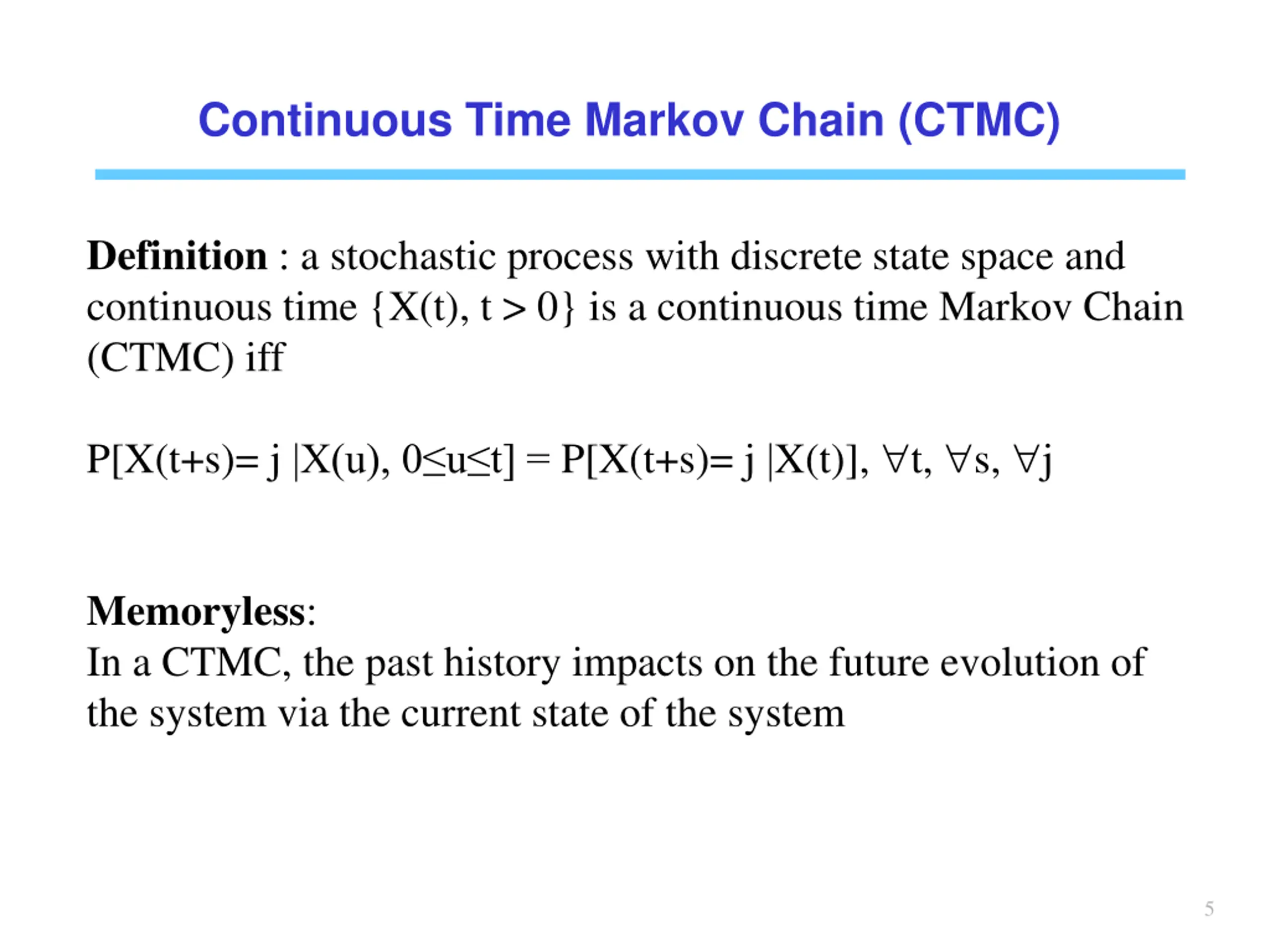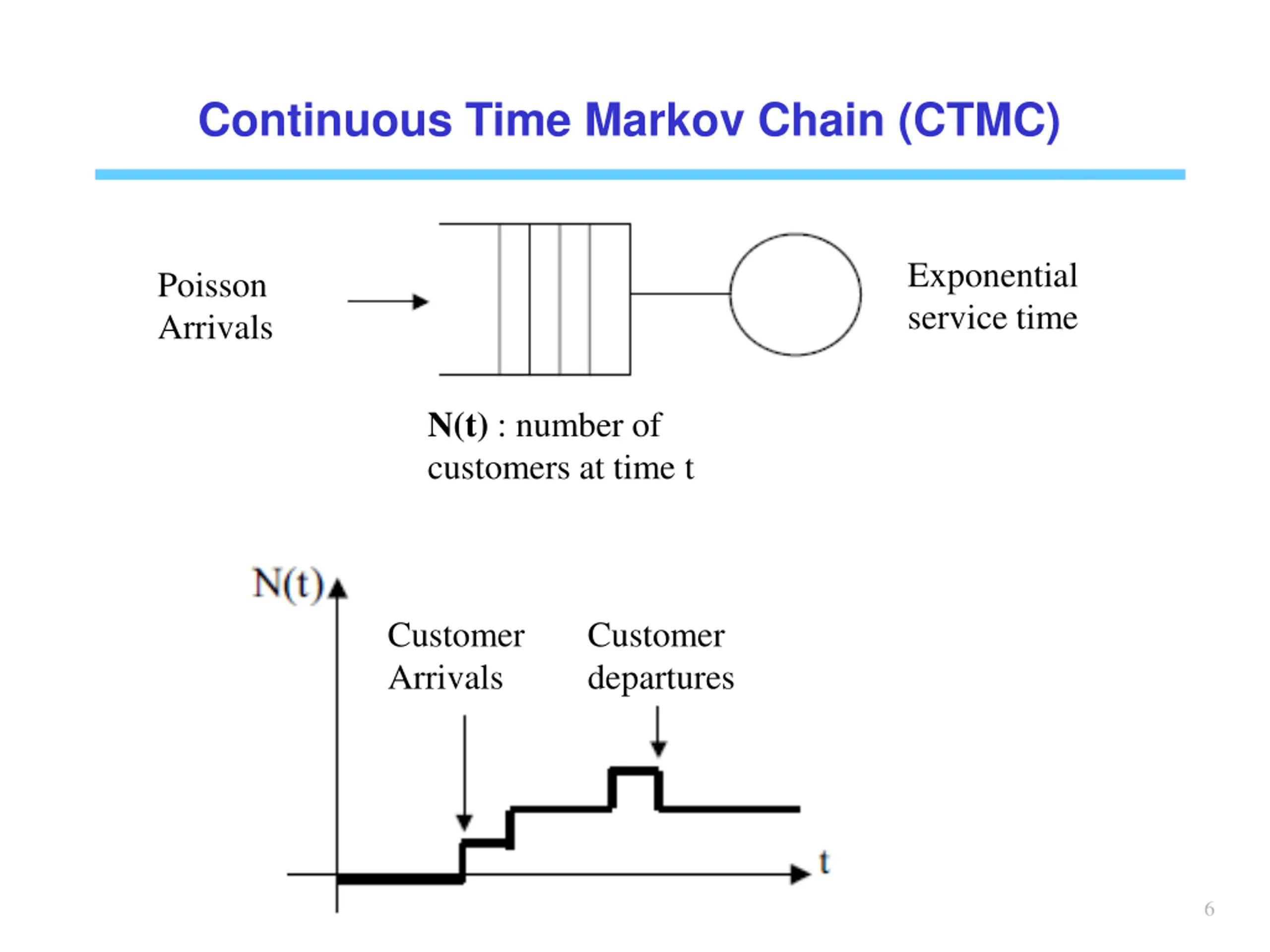 Continuous Time Markov Chain (CTMC) Definition : a stochastic process with discrete state space and continuous time {X(t), t > 0} is a continuous time Markov Chain (CTMC) iff P[X(t+s)= j X(u), 0 u t] = P[X(t+s)= j X(t)], t, s, j Memoryless: In a CTMC, the past history impacts on the future evolution of the system via the current state of the system 5