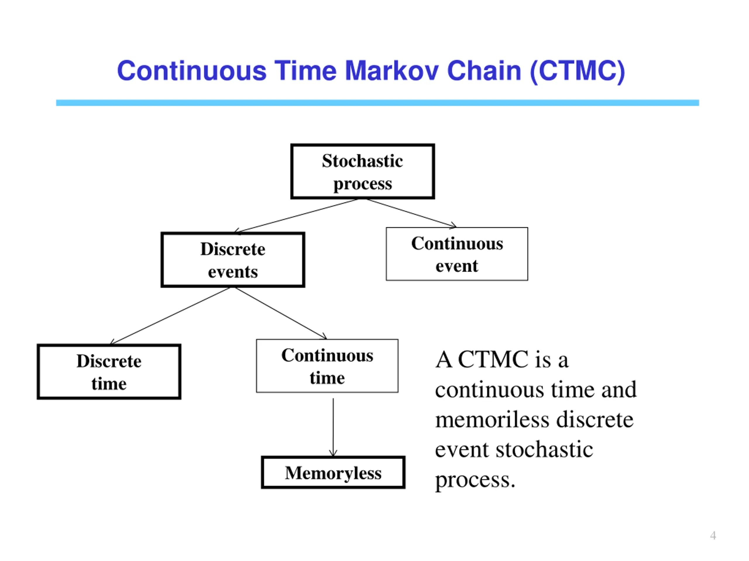 Continuous Time Markov Chain (CTMC) Stochastic process Continuous event Discrete events Continuous time A CTMC is a continuous time and memoriless discrete event stochastic process. Discrete time Memoryless 4