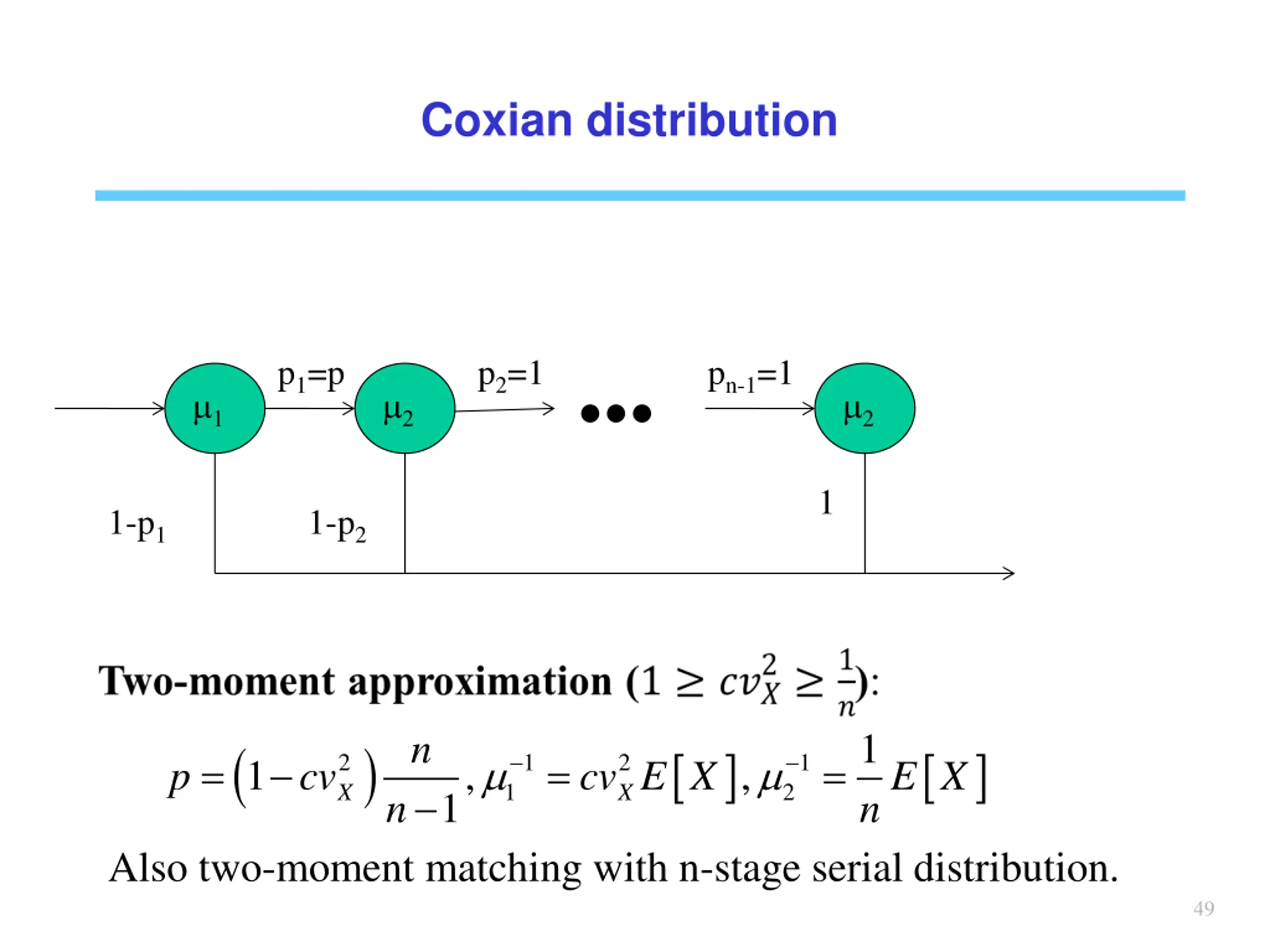 Coxian distribution p1=p p2=1 pn-1=1 2 1 1-p1 1-p2 1 n n ( ) E X = = = 2 X 1 2 X 1 1 , , p cv cv E X 1 2 1 n Also two-moment matching with n-stage serial distribution. 49