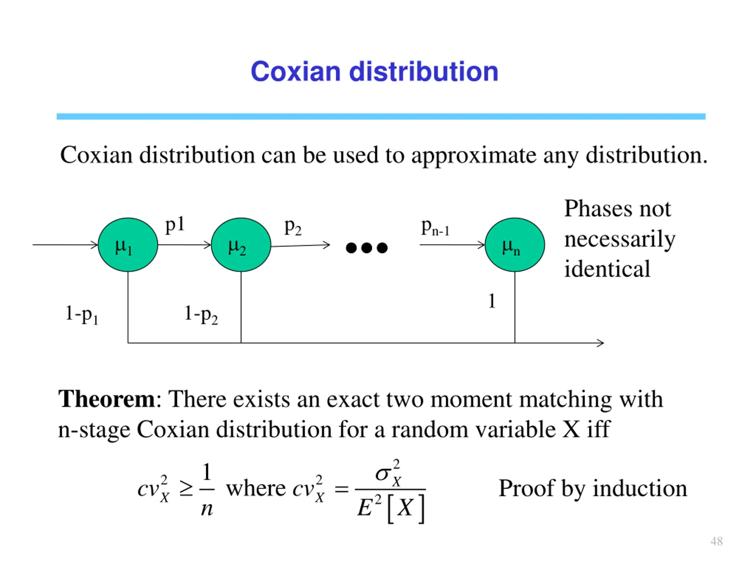 Hyper-exponential or mixture of exponential distribution X = 1X1 + 2X2 ... + nXn where P(Ii = 1) = i, P(Ii = 0) = 1- i 1 + 2 ... + n = 1, Xi = EXP( i) By Jensen s inequality, 2 X E[X] = 1/ 1 + 2/ 2 ... + n/ n E[X2] = 2 1/ 12 + 2 2/ 22 ... + 2 n/ n2 2 i 2 X 2 E i i i i i 1 cv X Two moment matching of a random variable X with mean m and variance 2 m2 (???) X = 1X1 + 2X2where X1 = EXP( 1), X2 = 0 47
