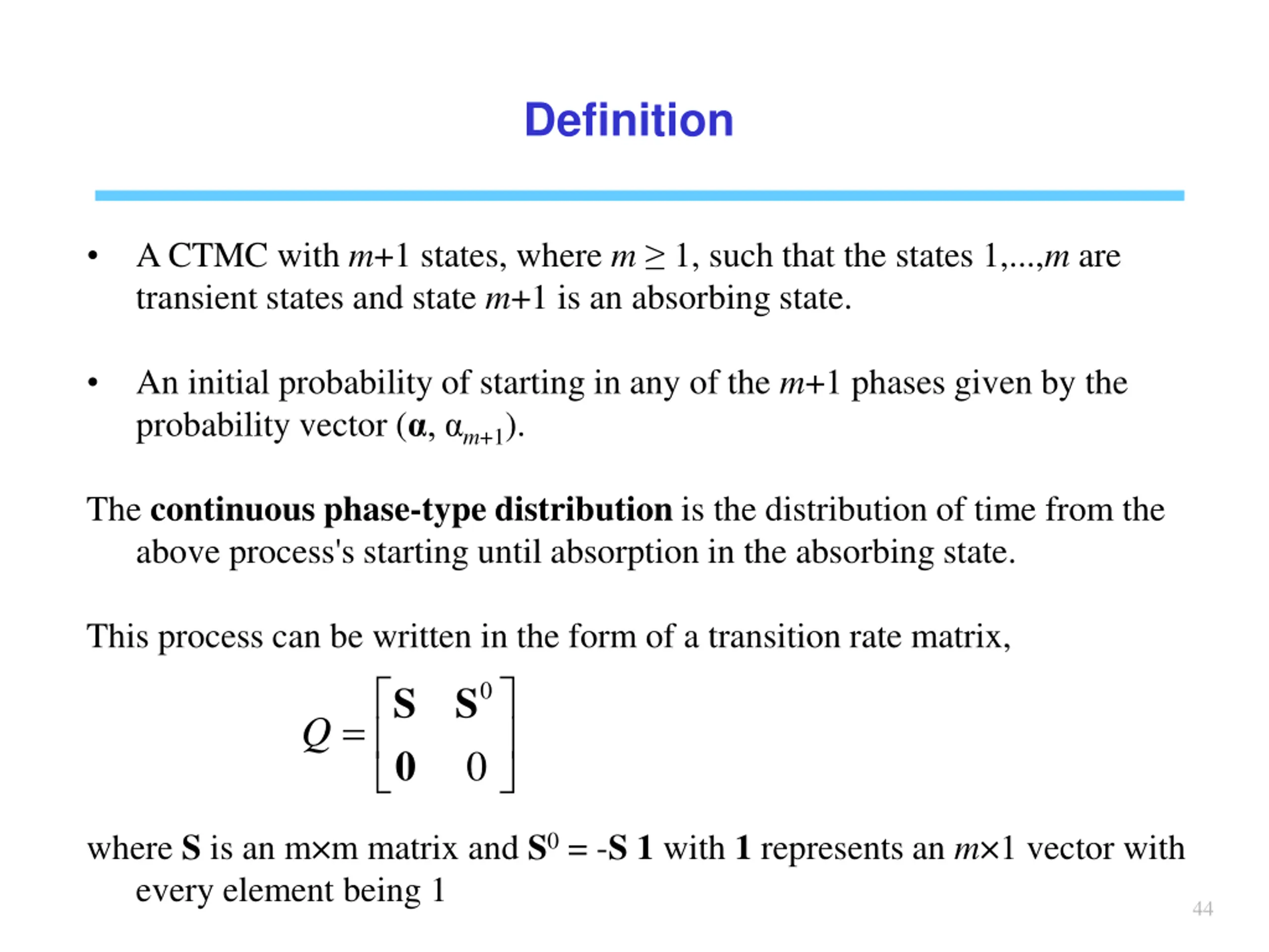 Definition A CTMC with m+1 states, where m 1, such that the states 1,...,m are transient states and state m+1 is an absorbing state. An initial probability of starting in any of the m+1 phases given by the probability vector ( , m+1). The continuous phase-type distribution is the distribution of time from the above process's starting until absorption in the absorbing state. This process can be written in the form of a transition rate matrix, = 0 0 S S Q 0 where S is an m m matrix and S0 = -S 1 with 1 represents an m 1 vector with every element being 1 44