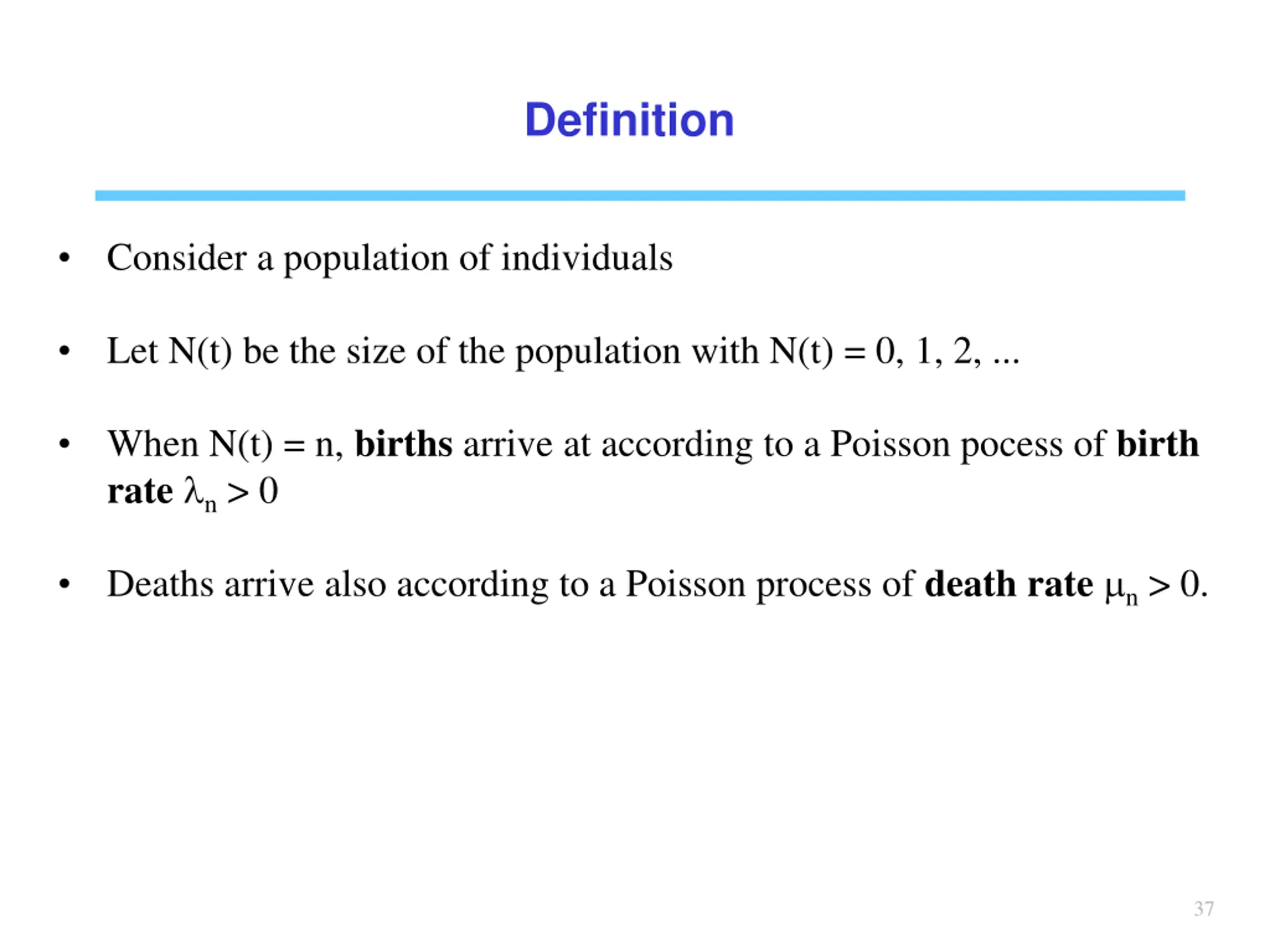 Definition Consider a population of individuals Let N(t) be the size of the population with N(t) = 0, 1, 2, ... When N(t) = n, births arrive at according to a Poisson pocess of birth rate n > 0 Deaths arrive also according to a Poisson process of death rate n > 0. 37