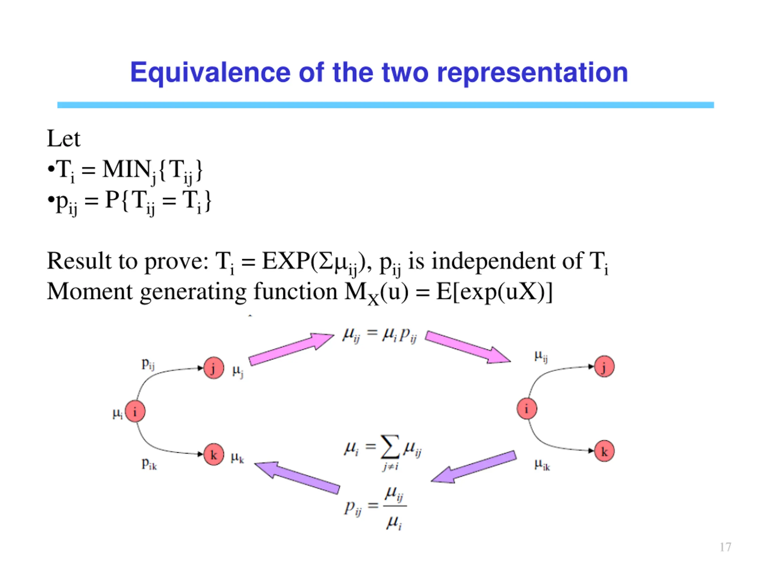 Equivalence of the two representation Let Ti= MINj{Tij} pij= P{Tij= Ti} Result to prove: Ti= EXP( ij), pijis independent of Ti Moment generating function MX(u) = E[exp(uX)] 17