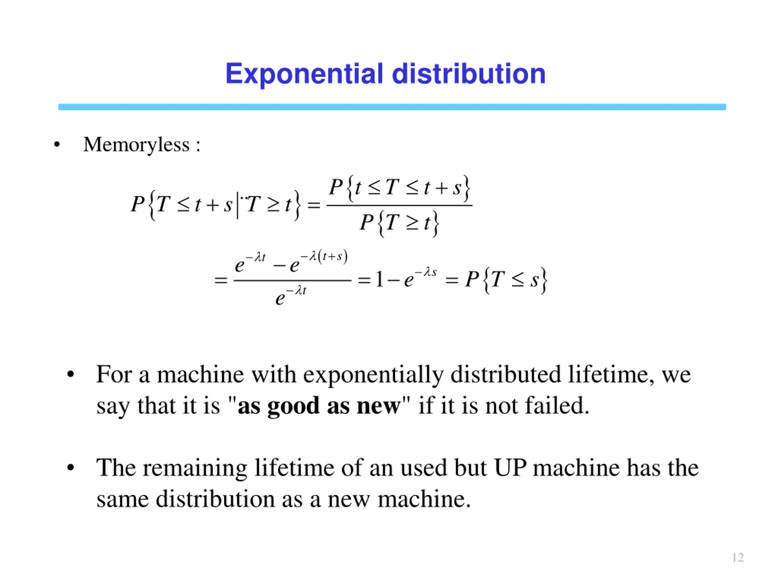 Exponential distribution Memoryless : + P t T t t s + = P T t s T t P T ( ) t s + t e e = = = s 1 e P T s t e For a machine with exponentially distributed lifetime, we say that it is "as good as new" if it is not failed. The remaining lifetime of an used but UP machine has the same distribution as a new machine. 12