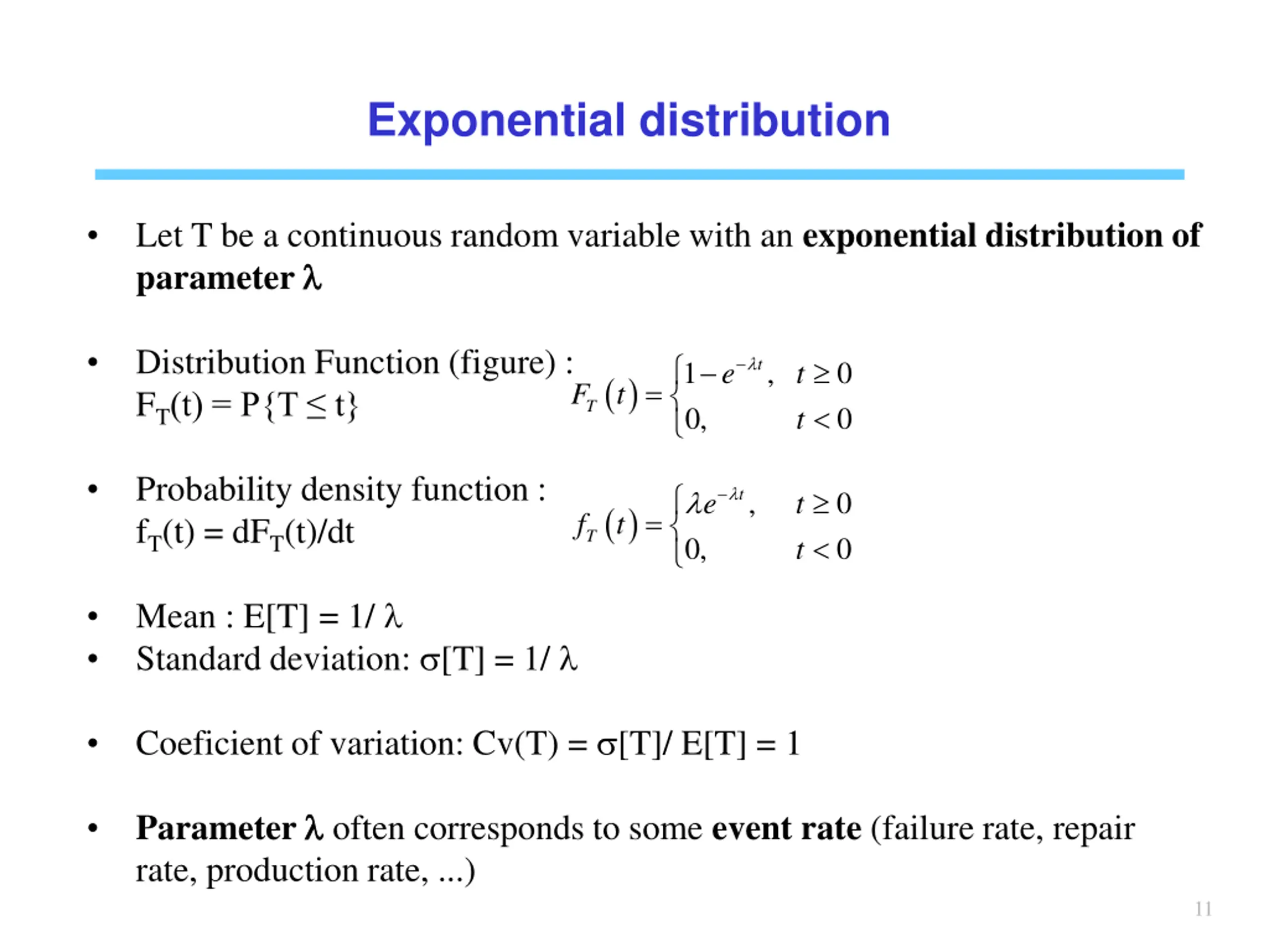 Exponential distribution Let T be a continuous random variable with an exponential distribution of parameter Distribution Function (figure) : FT(t) = P{T t} t 1 0, , 0 0 e t t ( ) = F t T Probability density function : fT(t) = dFT(t)/dt t , 0 0 e t t ( ) t = f T 0, Mean : E[T] = 1/ Standard deviation: [T] = 1/ Coeficient of variation: Cv(T) = [T]/ E[T] = 1 Parameter often corresponds to some event rate (failure rate, repair rate, production rate, ...) 11