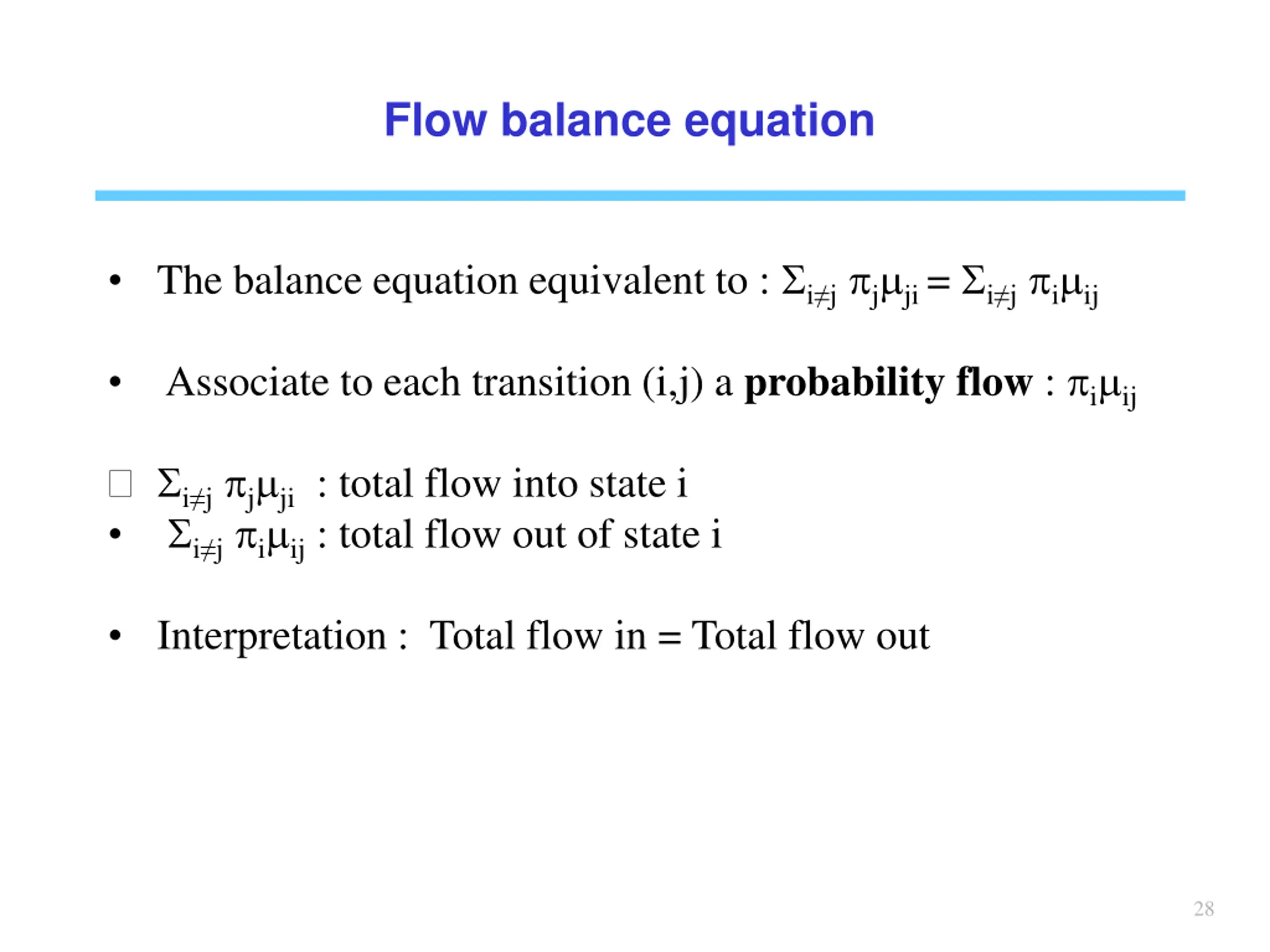 Flow balance equation The balance equation equivalent to : i j j ji = i j i ij Associate to each transition (i,j) a probability flow : i ij i j j ji: total flow into state i i j i ij: total flow out of state i Interpretation : Total flow in = Total flow out 28