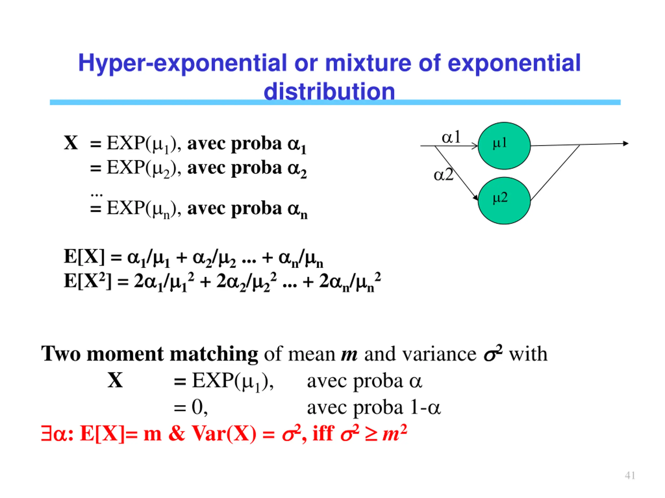 Hyper-exponential or mixture of exponential distribution X = EXP( 1), avec proba 1 = EXP( 2), avec proba 2 = EXP( n), avec proba n E[X] = 1/ 1 + 2/ 2 ... + n/ n E[X2] = 2 1/ 12 + 2 2/ 22 ... + 2 n/ n2 Two moment matching of mean m and variance 2 with X = EXP( 1), = 0, : E[X]= m & Var(X) = 2, iff 2 m2 avec proba avec proba 1- 41