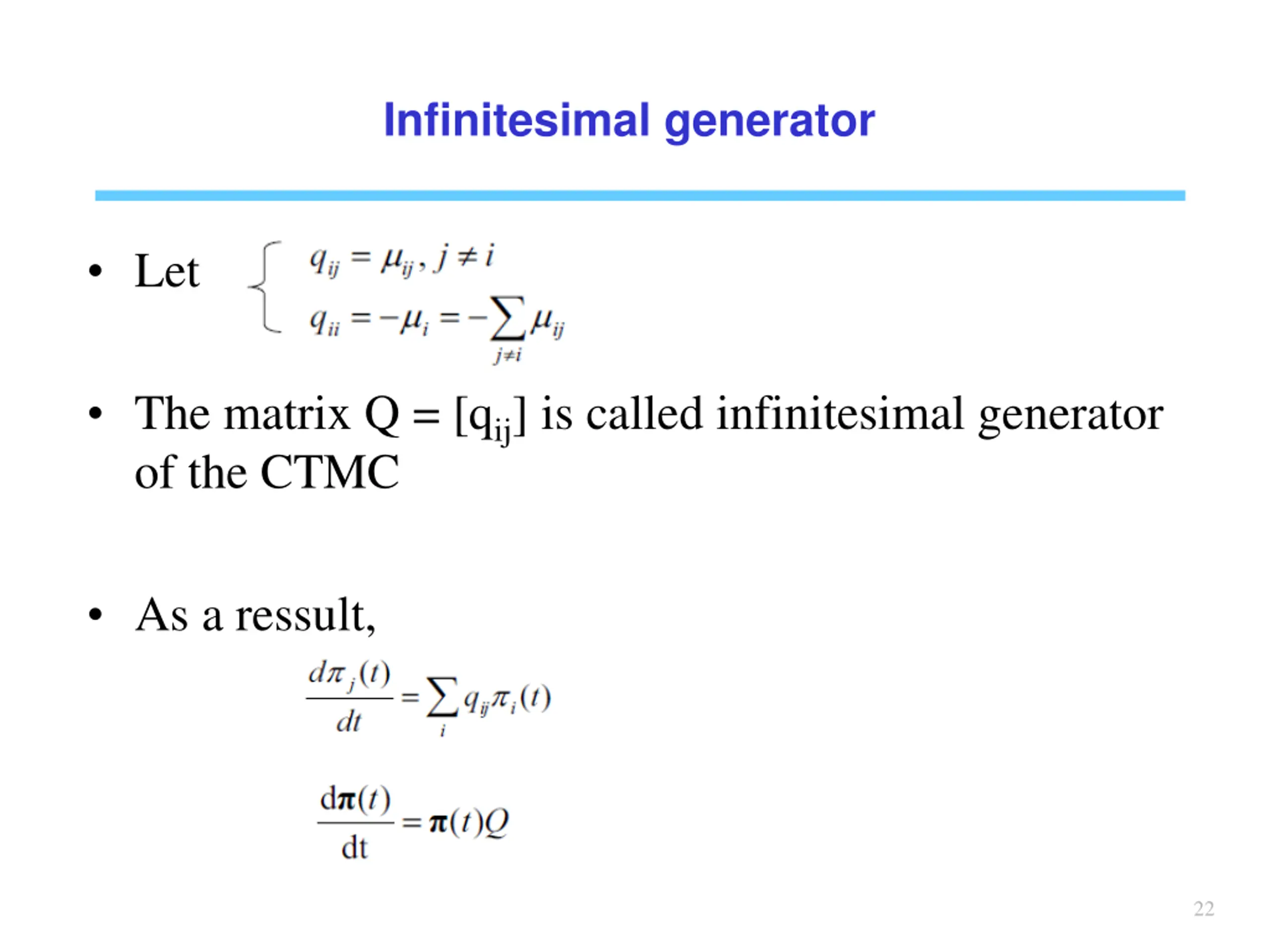 Infinitesimal generator Let The matrix Q = [qij] is called infinitesimal generator of the CTMC As a ressult, 22