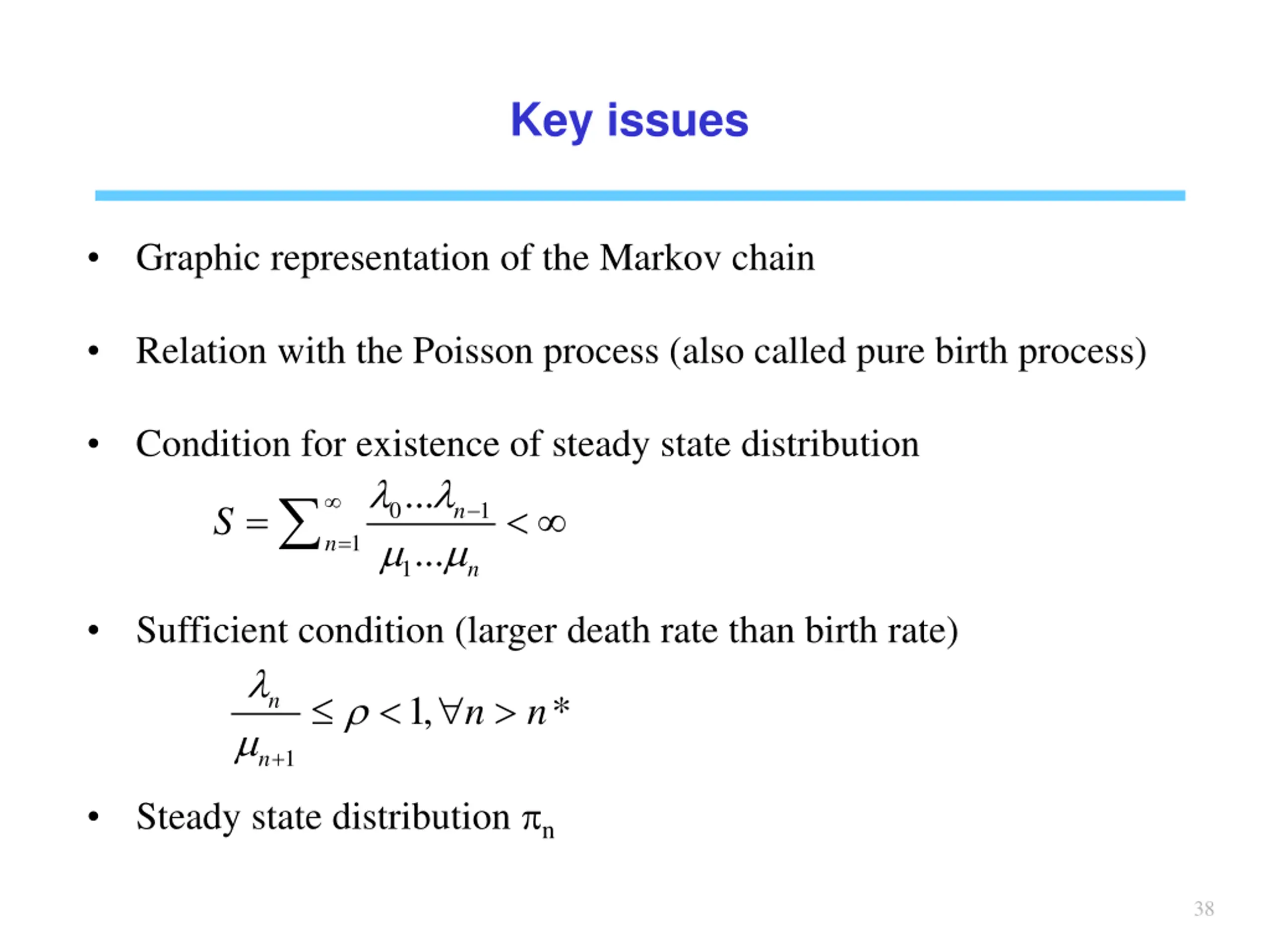 Key issues Graphic representation of the Markov chain Relation with the Poisson process (also called pure birth process) Condition for existence of steady state distribution ... ... n = 0 1 n S = 1 n 1 Sufficient condition (larger death rate than birth rate) + n 1, * n n 1 n Steady state distribution n 38