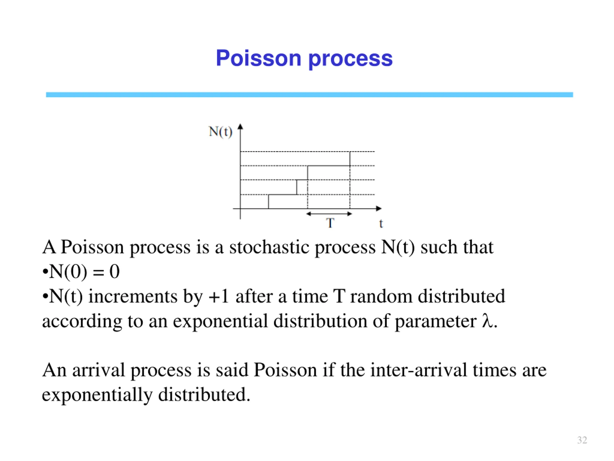 Poisson process A Poisson process is a stochastic process N(t) such that N(0) = 0 N(t) increments by +1 after a time T random distributed according to an exponential distribution of parameter . An arrival process is said Poisson if the inter-arrival times are exponentially distributed. 32