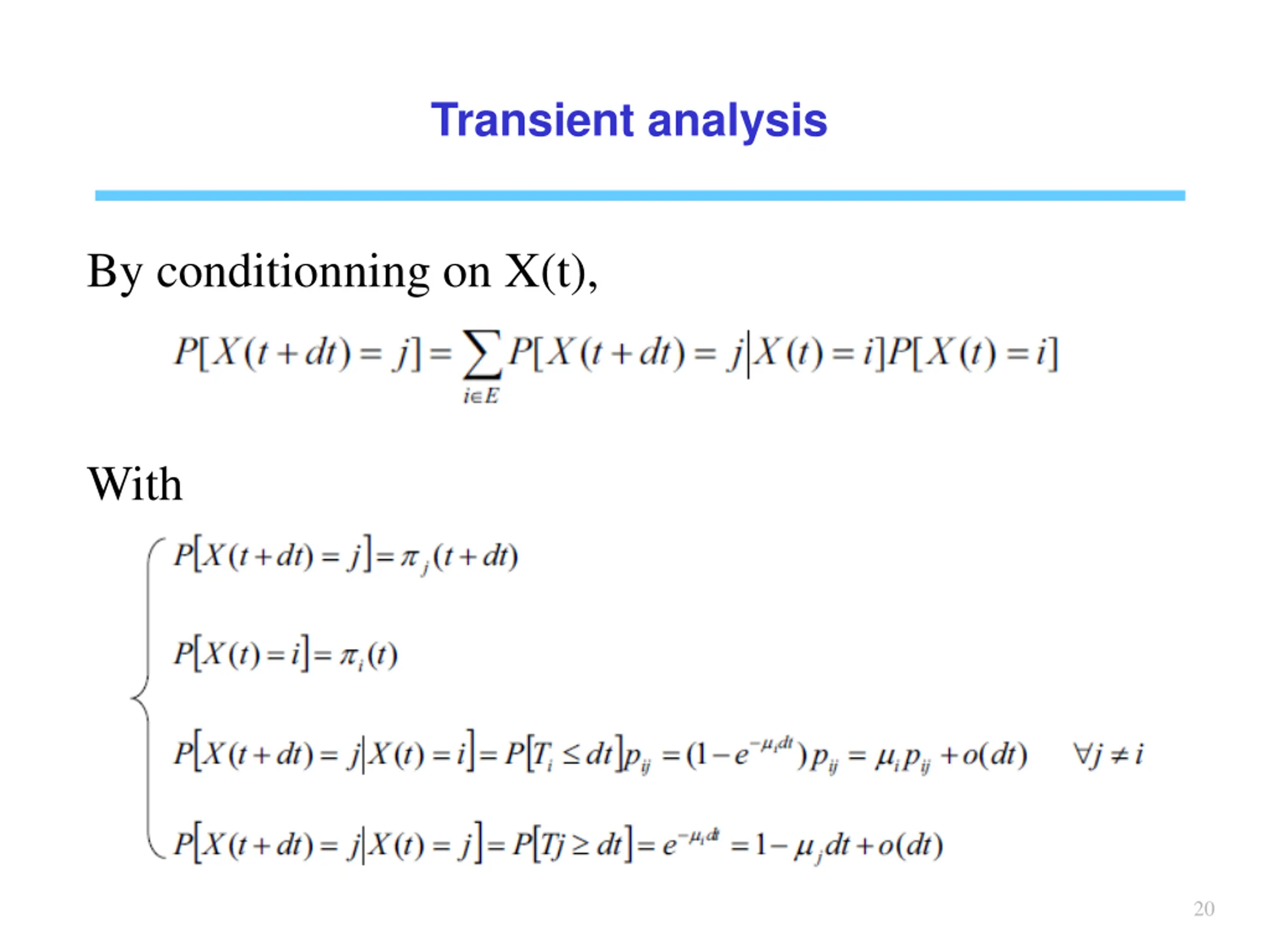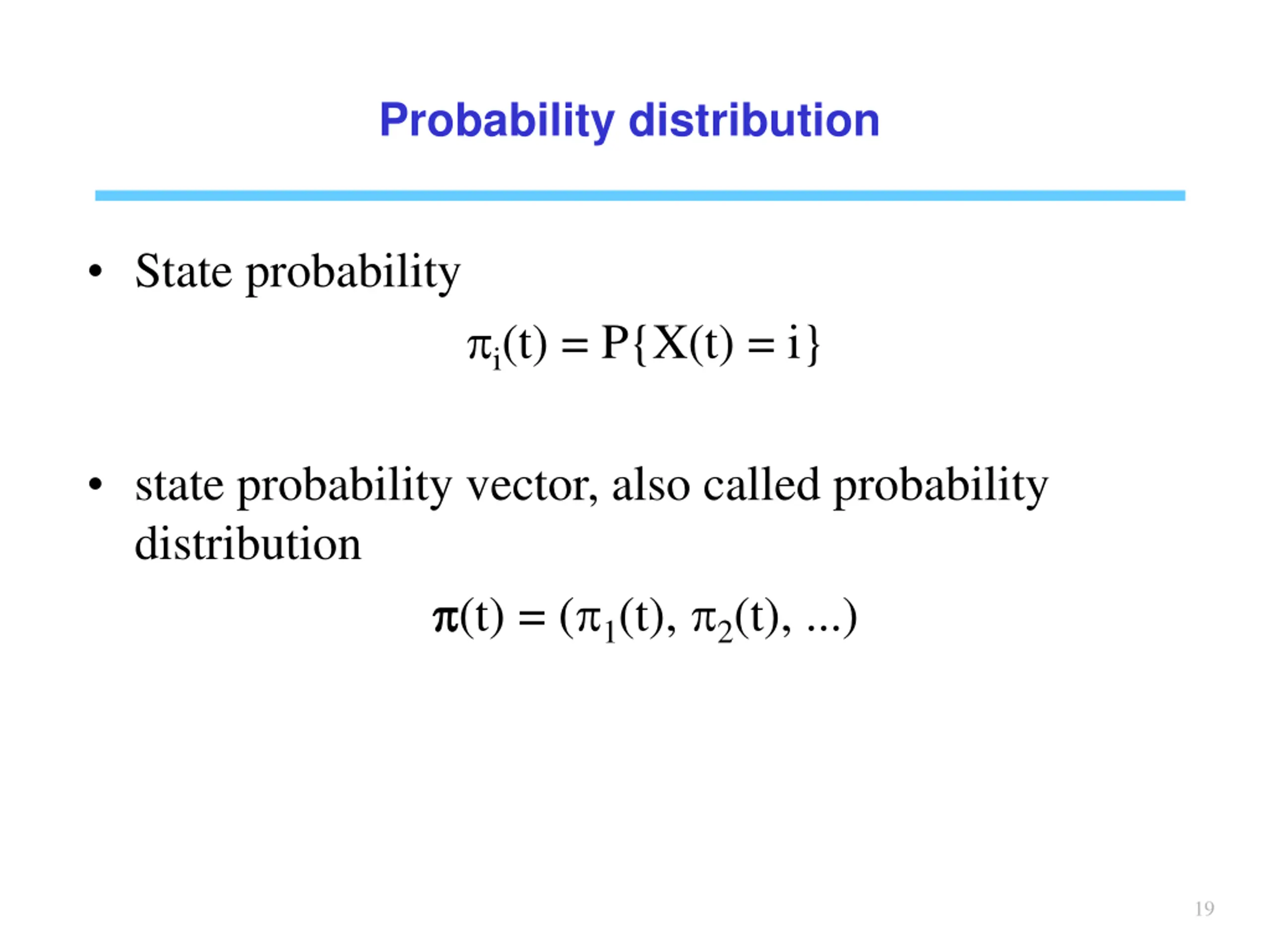 Probability distribution State probability i(t) = P{X(t) = i} state probability vector, also called probability distribution (t) = ( 1(t), 2(t), ...) 19