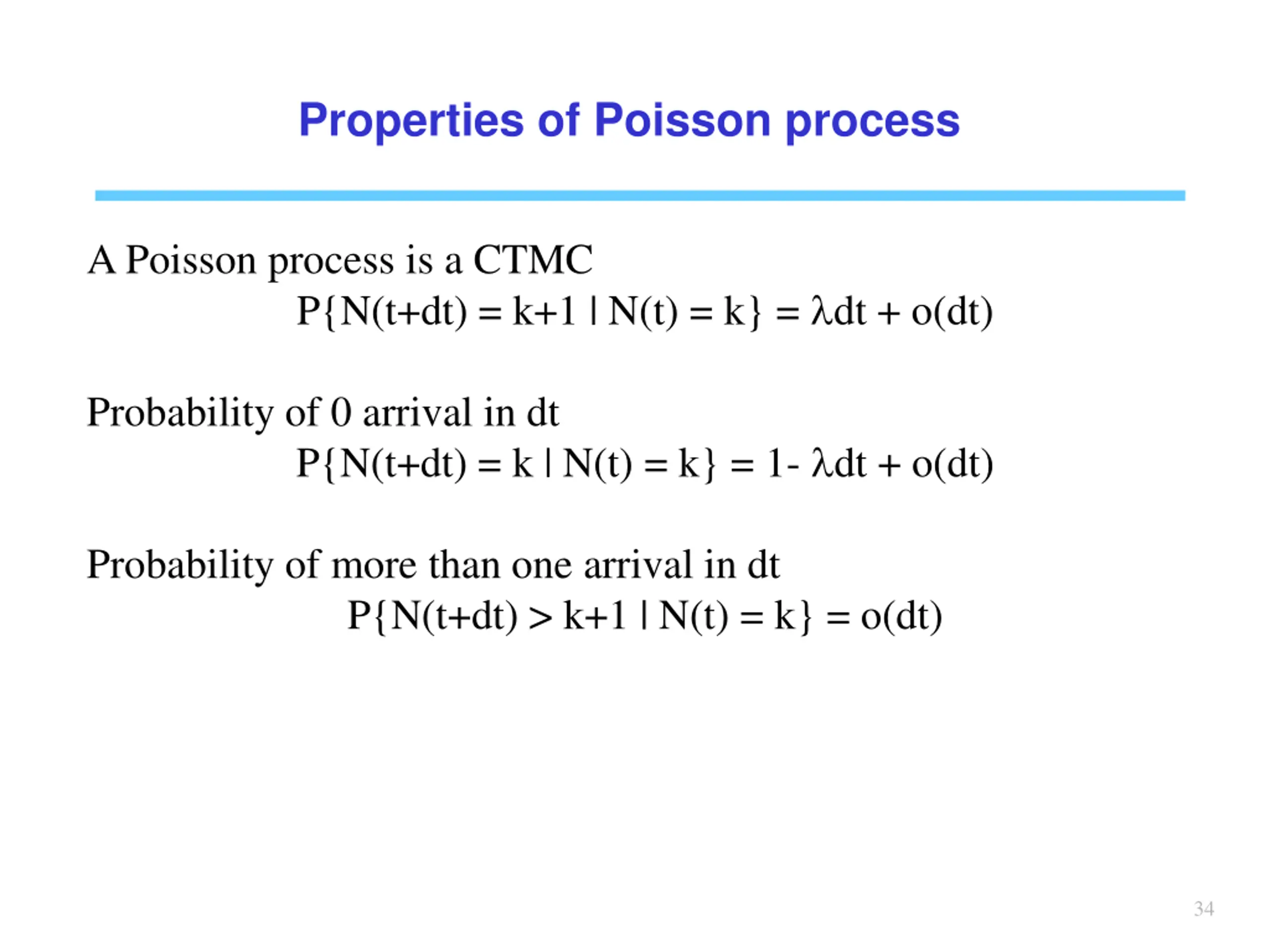 Properties of Poisson process A Poisson process is a CTMC P{N(t+dt) = k+1 | N(t) = k} = dt + o(dt) Probability of 0 arrival in dt P{N(t+dt) = k | N(t) = k} = 1- dt + o(dt) Probability of more than one arrival in dt P{N(t+dt) > k+1 | N(t) = k} = o(dt) 34
