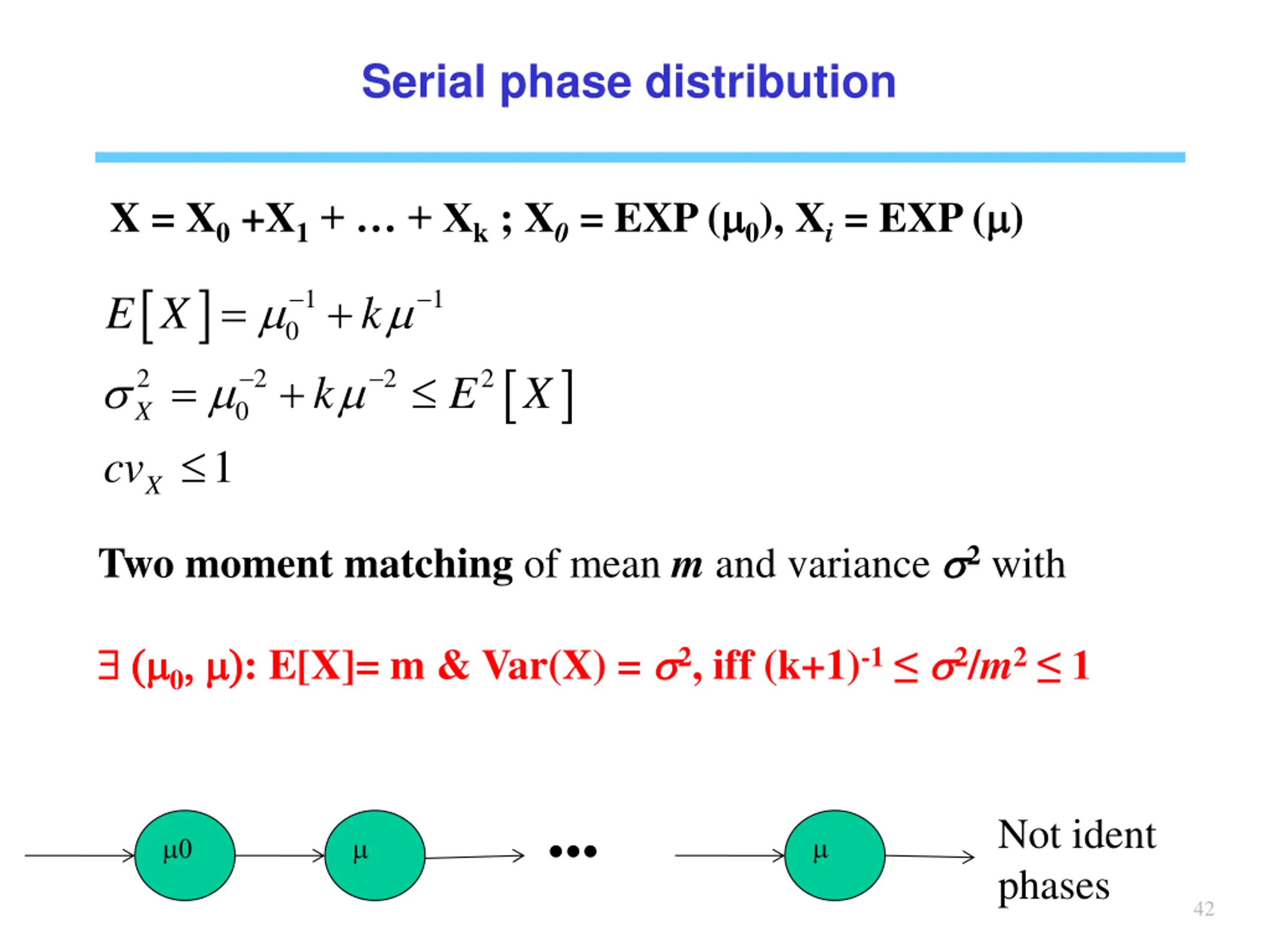 Serial phase distribution X = X0 +X1+ + Xk ; X0 = EXP ( 0), Xi = EXP ( ) E X = + 1 1 k 0 + X = 2 X 2 2 2 k E 0 1 cv X Two moment matching of mean m and variance 2 with ( ( 0 ) ): E[X]= m & Var(X) = 2, iff (k+1)-1 2/m2 1 Not ident phases 42
