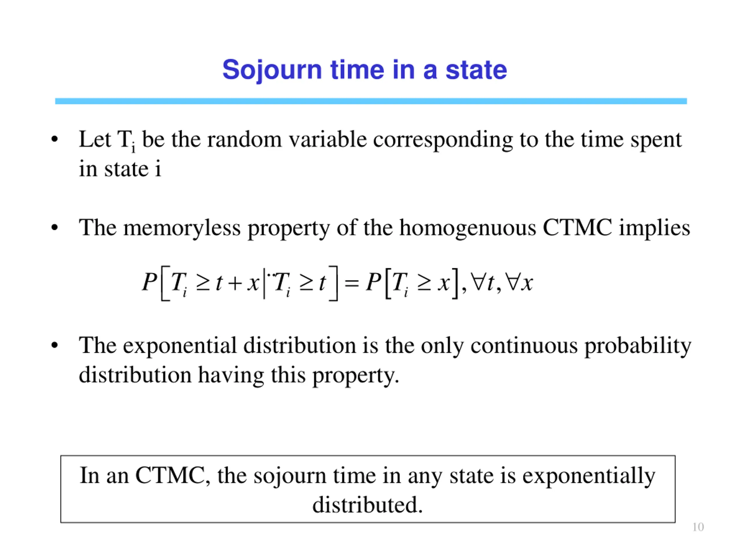 Sojourn time in a state Let Tibe the random variable corresponding to the time spent in state i The memoryless property of the homogenuous CTMC implies P T + = , , t x T t P T x t x i i i The exponential distribution is the only continuous probability distribution having this property. In an CTMC, the sojourn time in any state is exponentially distributed. 10