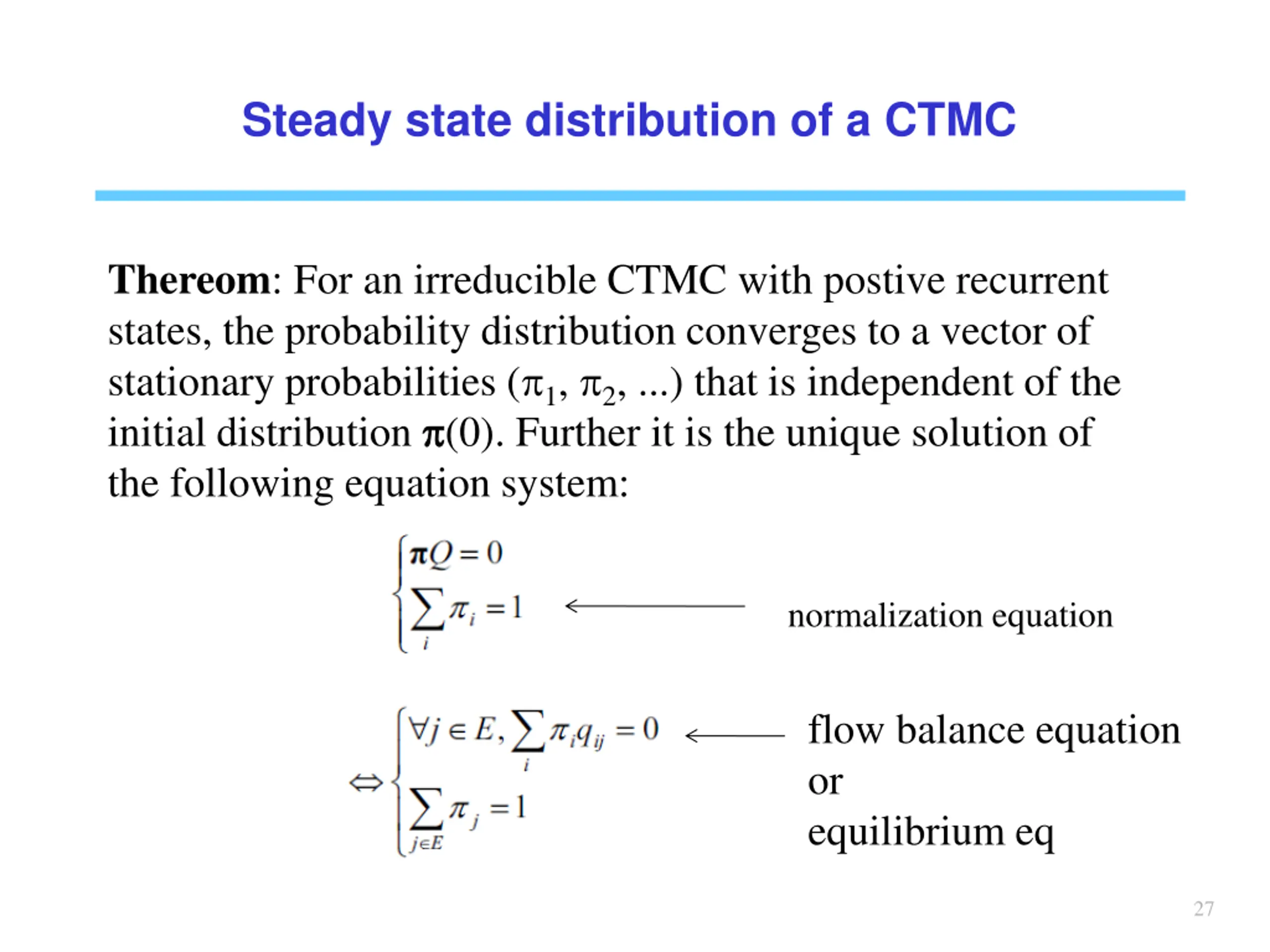 Steady state distribution of a CTMC Thereom: For an irreducible CTMC with postive recurrent states, the probability distribution converges to a vector of stationary probabilities ( 1, 2, ...) that is independent of the initial distribution (0). Further it is the unique solution of the following equation system: normalization equation flow balance equation or equilibrium eq 27