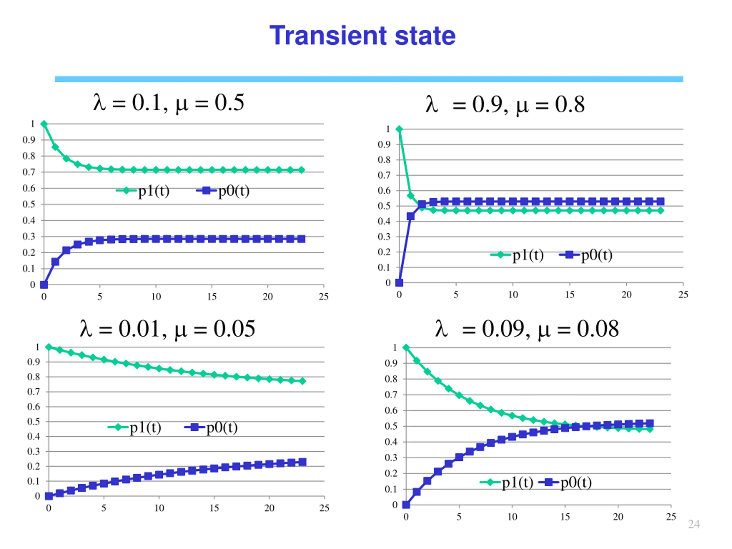 Transient state = 0.1, = 0.5 = 0.9, = 0.8 1 1 0.9 0.9 0.8 0.8 0.7 0.7 p1(t) p0(t) 0.6 0.6 0.5 0.5 0.4 0.4 0.3 0.3 p1(t) p0(t) 0.2 0.2 0.1 0.1 0 0 0 5 10 15 20 25 0 5 10 15 20 25 = 0.01, = 0.05 = 0.09, = 0.08 1 1 0.9 0.9 0.8 0.8 0.7 0.7 0.6 0.6 0.5 p1(t) p0(t) 0.5 0.4 0.4 0.3 0.3 0.2 0.2 p1(t) p0(t) 0.1 0.1 0 0 0 5 10 15 20 25 0 5 10 15 20 25 24