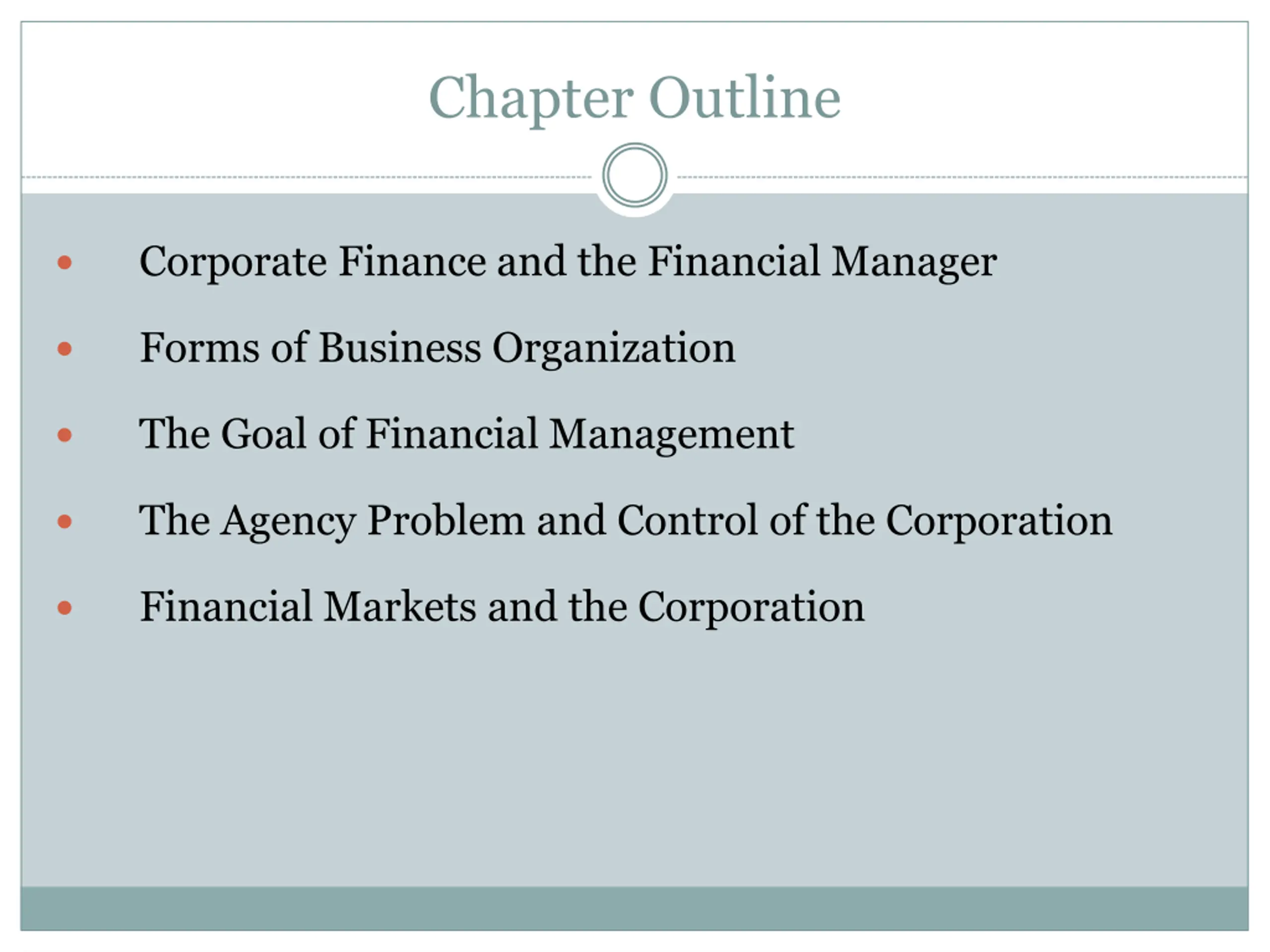 Chapter Outline Corporate Finance and the Financial Manager Forms of Business Organization The Goal of Financial Management The Agency Problem and Control of the Corporation Financial Markets and the Corporation
