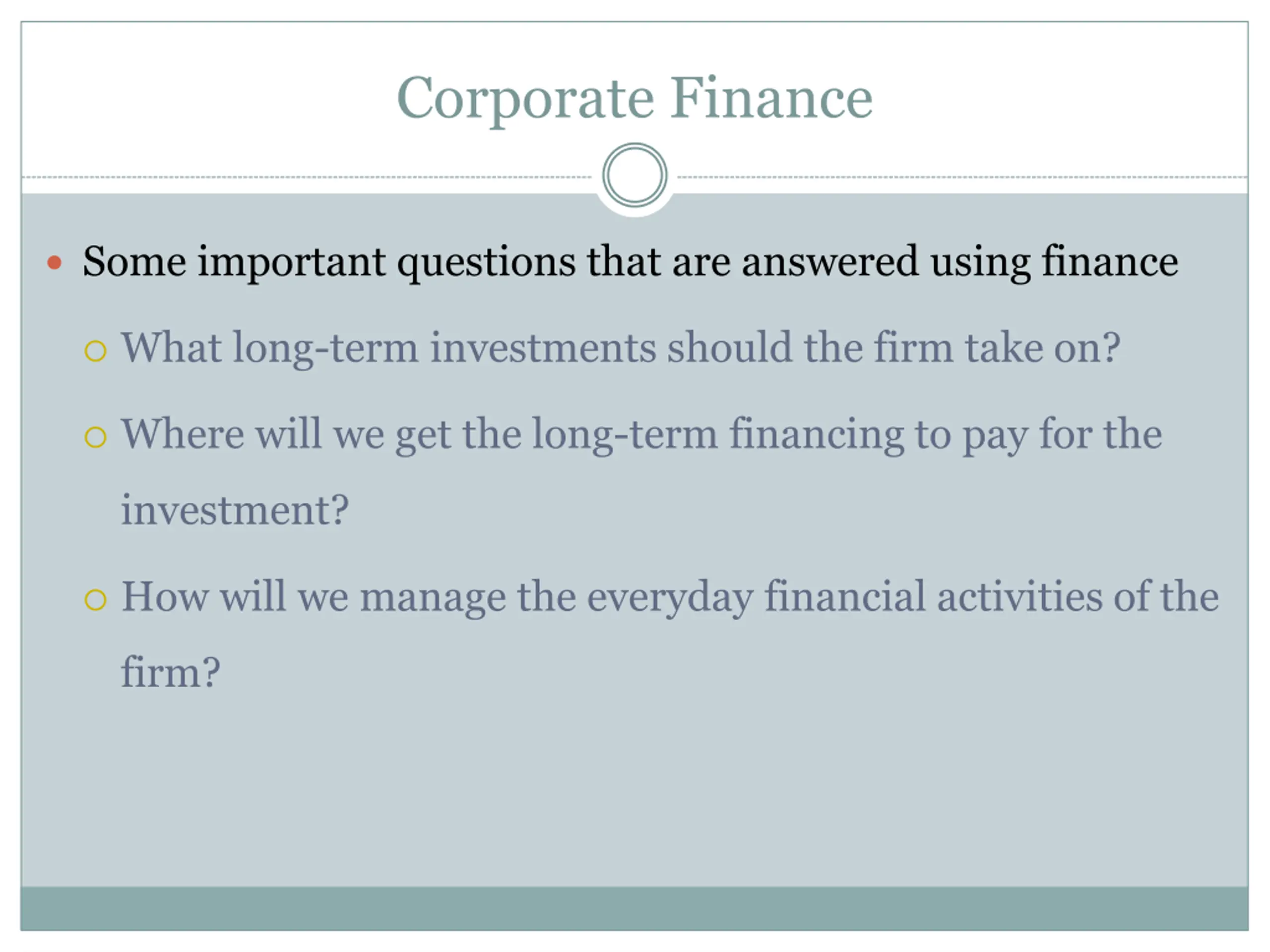 Corporate Finance Some important questions that are answered using finance What long-term investments should the firm take on? Where will we get the long-term financing to pay for the investment? How will we manage the everyday financial activities of the firm?