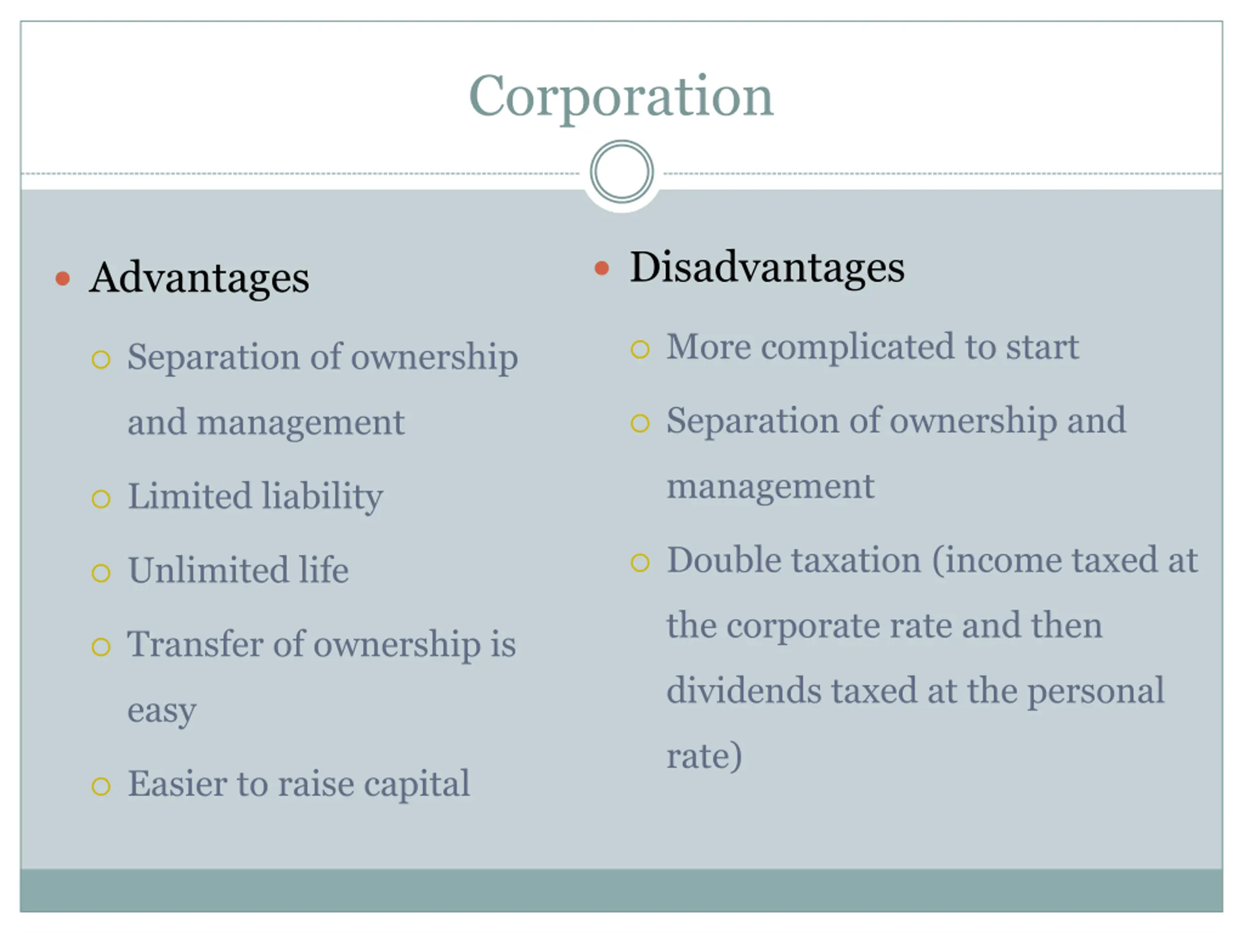 Corporation Disadvantages Advantages More complicated to start Separation of ownership Separation of ownership and and management management Limited liability Double taxation (income taxed at Unlimited life the corporate rate and then Transfer of ownership is dividends taxed at the personal easy rate) Easier to raise capital