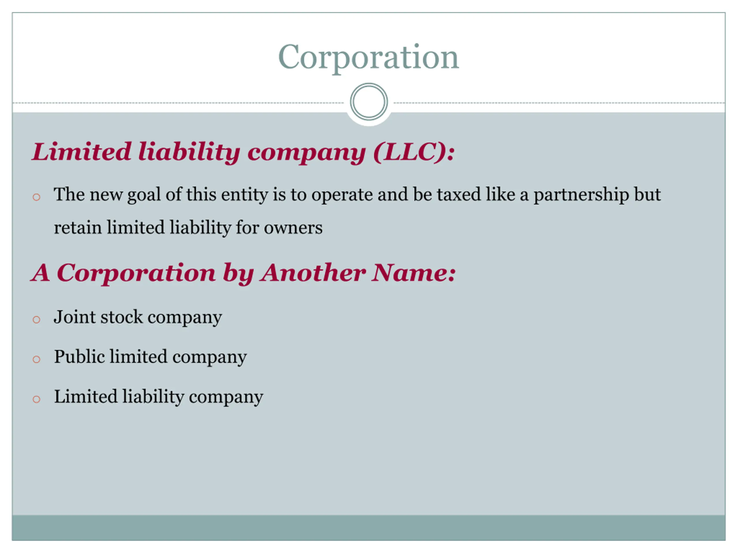 Corporation Limited liability company (LLC): o The new goal of this entity is to operate and be taxed like a partnership but retain limited liability for owners A Corporation by Another Name: o Joint stock company o Public limited company o Limited liability company