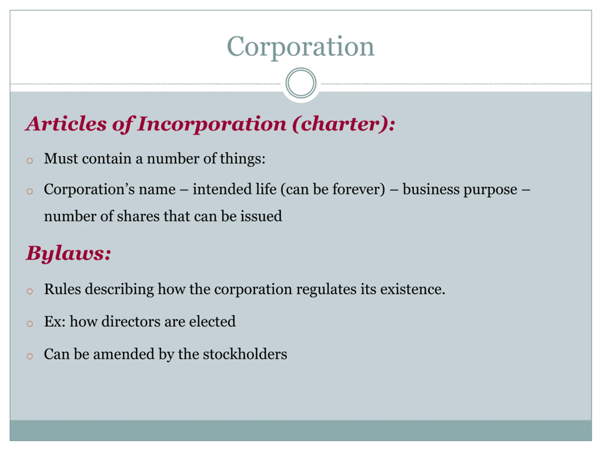 Corporation Articles of Incorporation (charter): o Must contain a number of things: o Corporation s name intended life (can be forever) business purpose number of shares that can be issued Bylaws: o Rules describing how the corporation regulates its existence. o Ex: how directors are elected o Can be amended by the stockholders