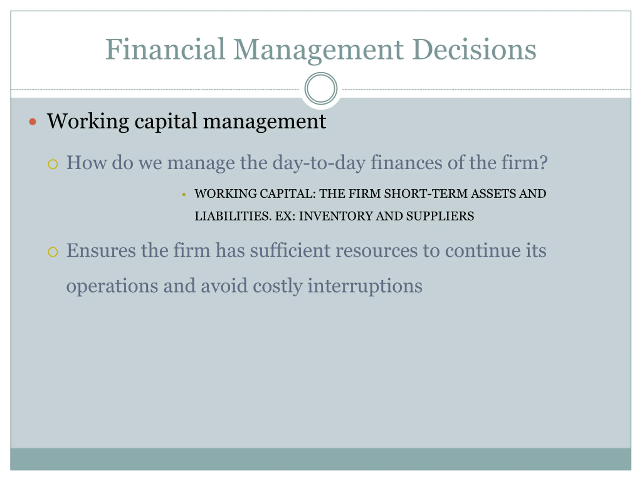 Financial Management Decisions Working capital management How do we manage the day-to-day finances of the firm? WORKING CAPITAL: THE FIRM SHORT-TERM ASSETS AND LIABILITIES. EX: INVENTORY AND SUPPLIERS Ensures the firm has sufficient resources to continue its operations and avoid costly interruptions