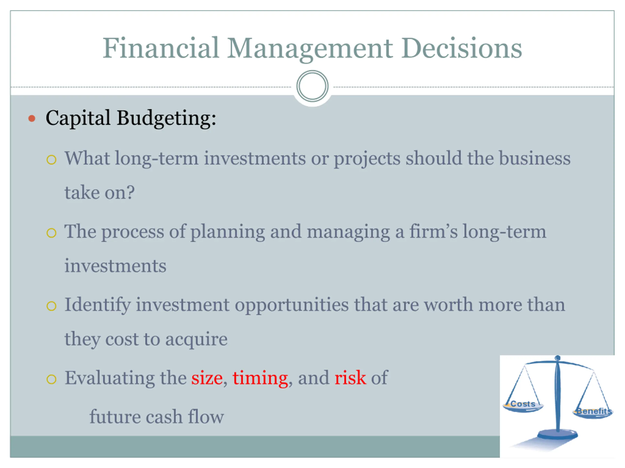 Financial Management Decisions Capital Budgeting: What long-term investments or projects should the business take on? The process of planning and managing a firm s long-term investments Identify investment opportunities that are worth more than they cost to acquire Evaluating the size, timing, and risk of future cash flow