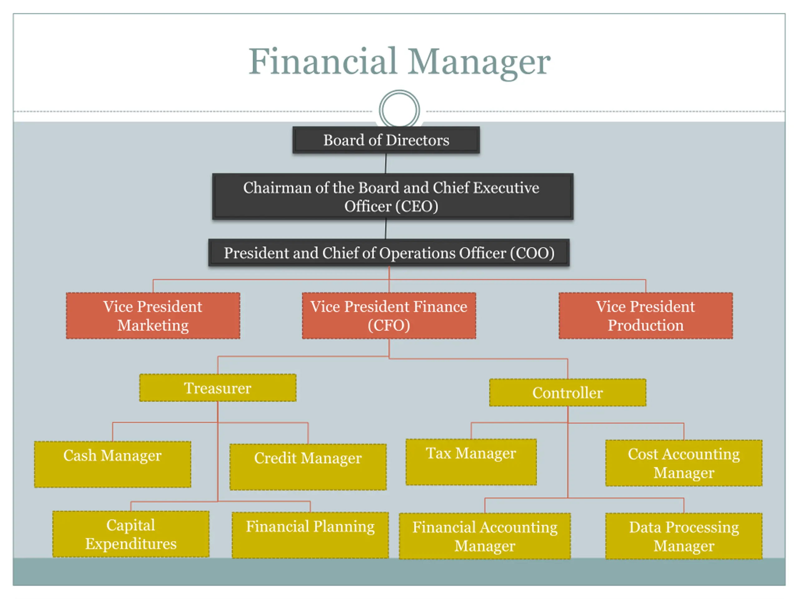 Financial Manager Board of Directors Chairman of the Board and Chief Executive Officer (CEO) President and Chief of Operations Officer (COO) Vice President Marketing Vice President Finance (CFO) Vice President Production Treasurer Controller Tax Manager Cost Accounting Manager Cash Manager Credit Manager Capital Expenditures Financial Planning Financial Accounting Manager Data Processing Manager