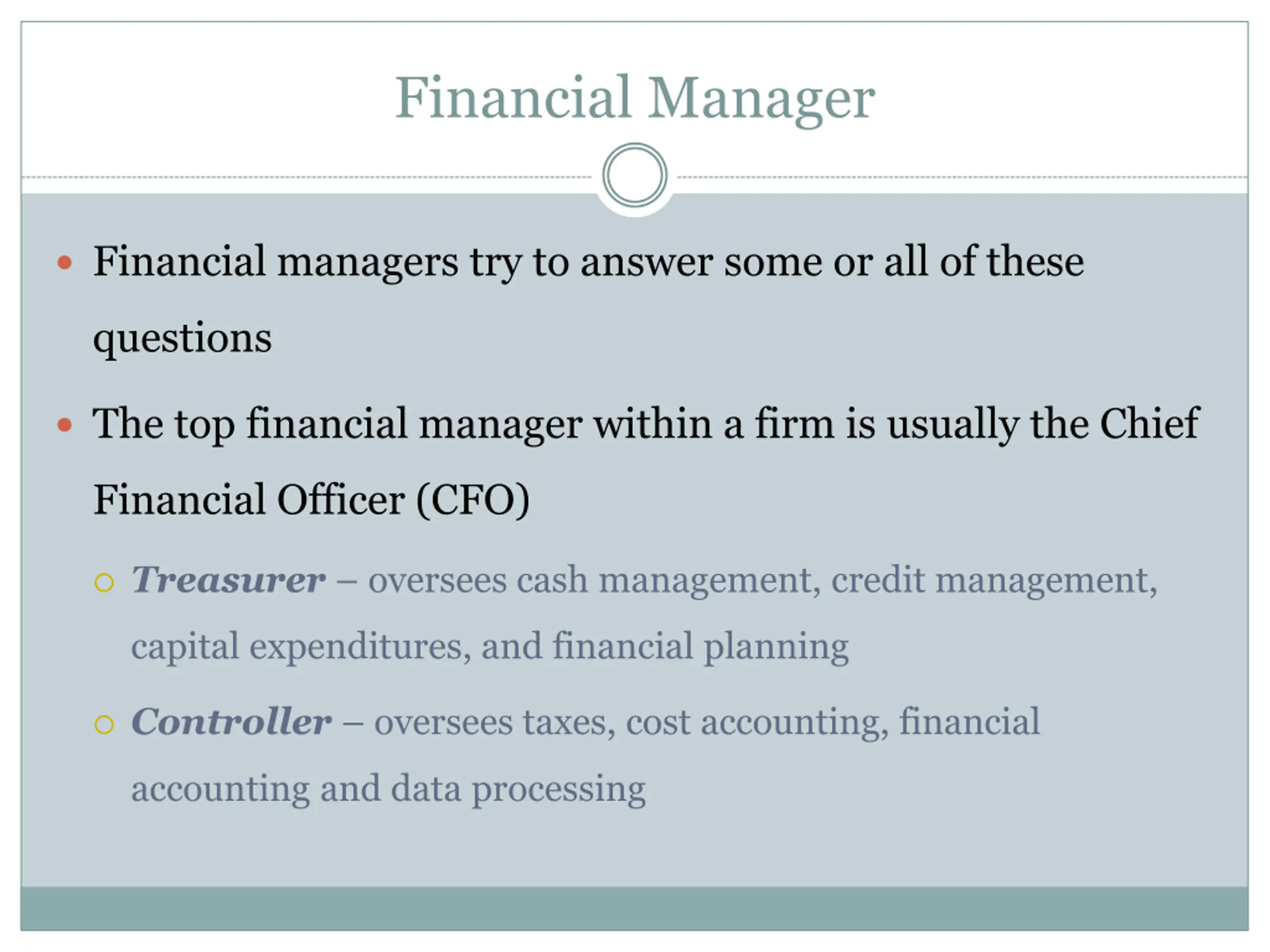 Financial Manager Financial managers try to answer some or all of these questions The top financial manager within a firm is usually the Chief Financial Officer (CFO) Treasurer oversees cash management, credit management, capital expenditures, and financial planning Controller oversees taxes, cost accounting, financial accounting and data processing