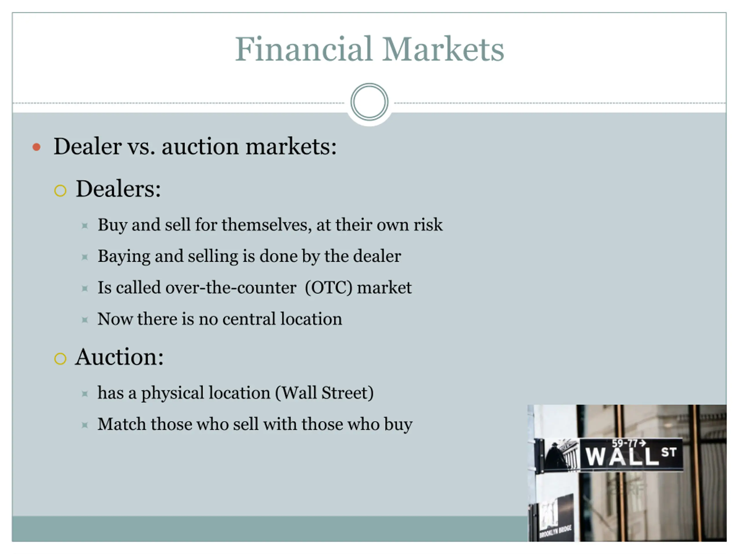 Financial Markets Dealer vs. auction markets: Dealers: Buy and sell for themselves, at their own risk Baying and selling is done by the dealer Is called over-the-counter (OTC) market Now there is no central location Auction: has a physical location (Wall Street) Match those who sell with those who buy
