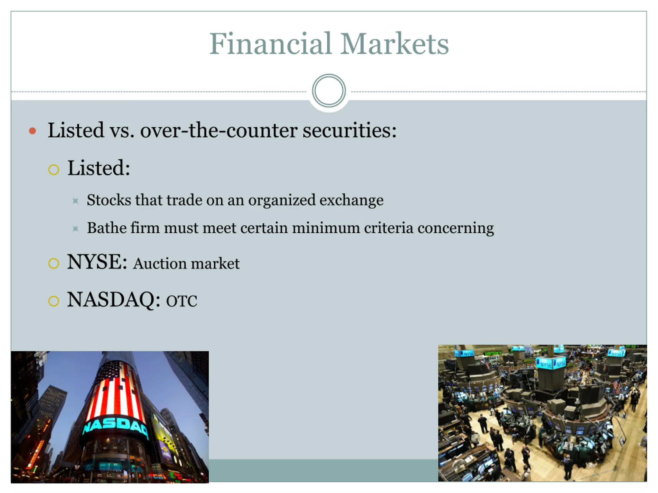 Financial Markets Listed vs. over-the-counter securities: Listed: Stocks that trade on an organized exchange Bathe firm must meet certain minimum criteria concerning NYSE: Auction market NASDAQ: OTC