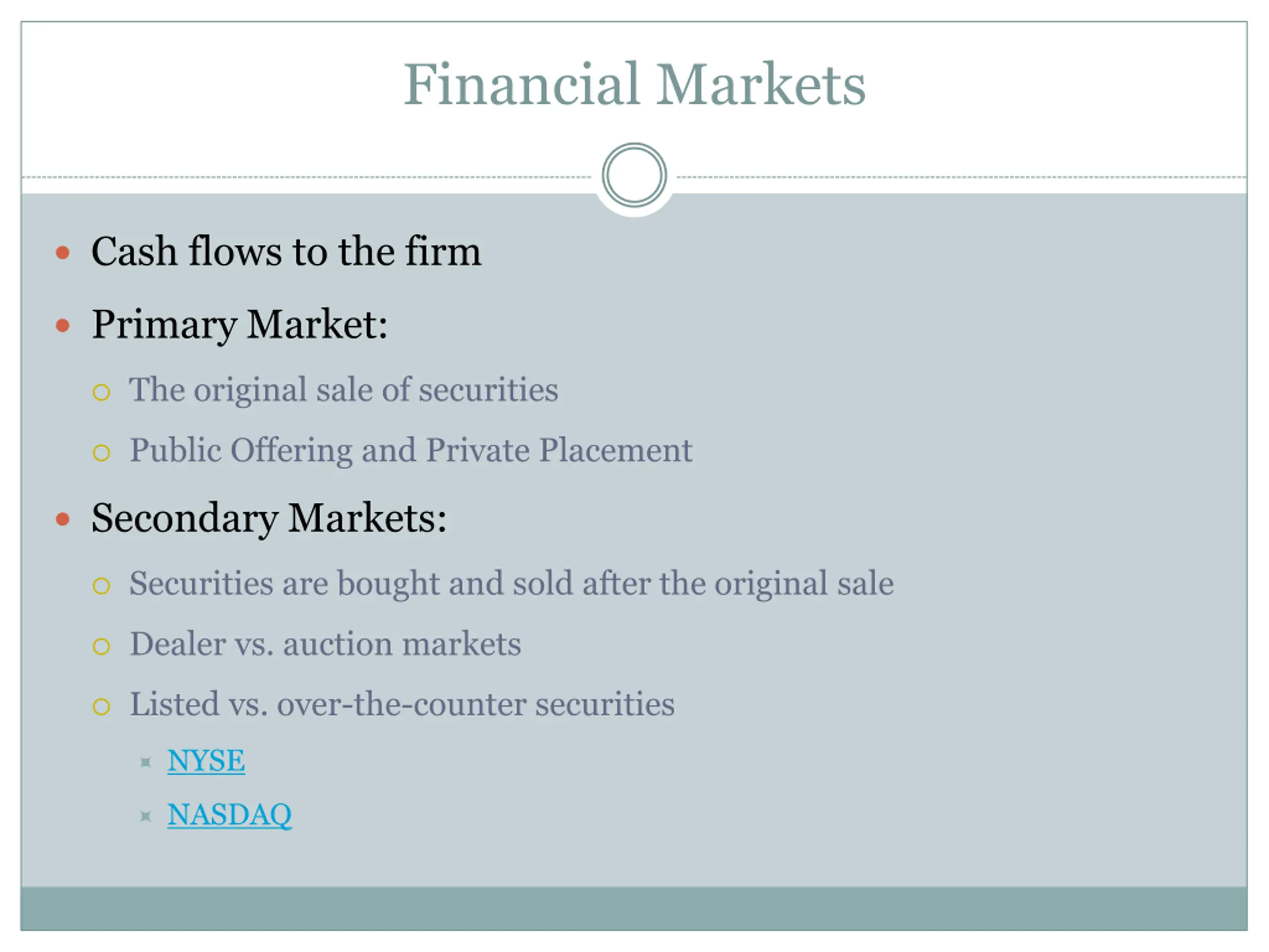 Financial Markets Cash flows to the firm Primary Market: The original sale of securities Public Offering and Private Placement Secondary Markets: Securities are bought and sold after the original sale Dealer vs. auction markets Listed vs. over-the-counter securities NYSE NASDAQ