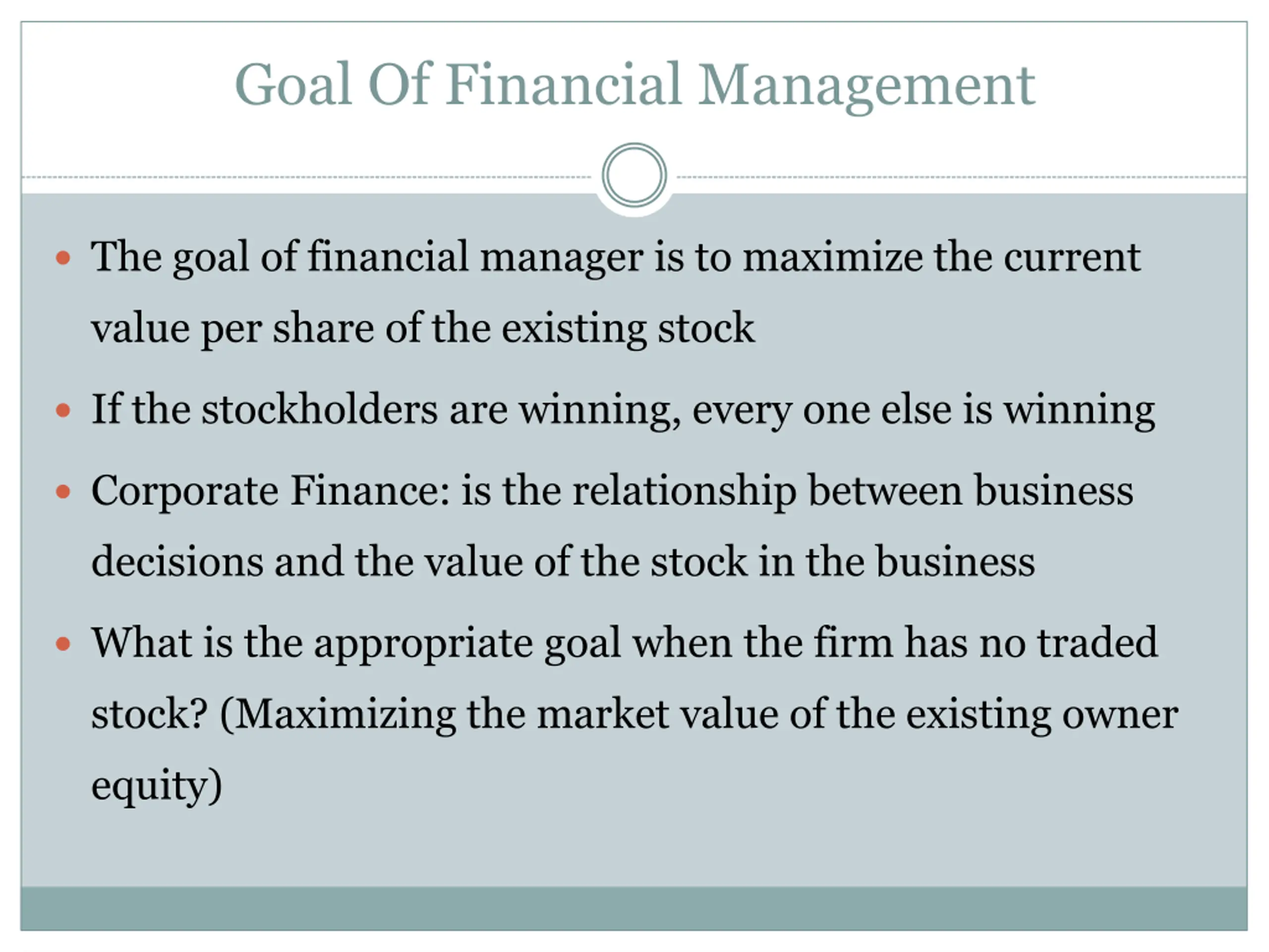 Goal Of Financial Management The goal of financial manager is to maximize the current value per share of the existing stock If the stockholders are winning, every one else is winning Corporate Finance: is the relationship between business decisions and the value of the stock in the business What is the appropriate goal when the firm has no traded stock? (Maximizing the market value of the existing owner equity)