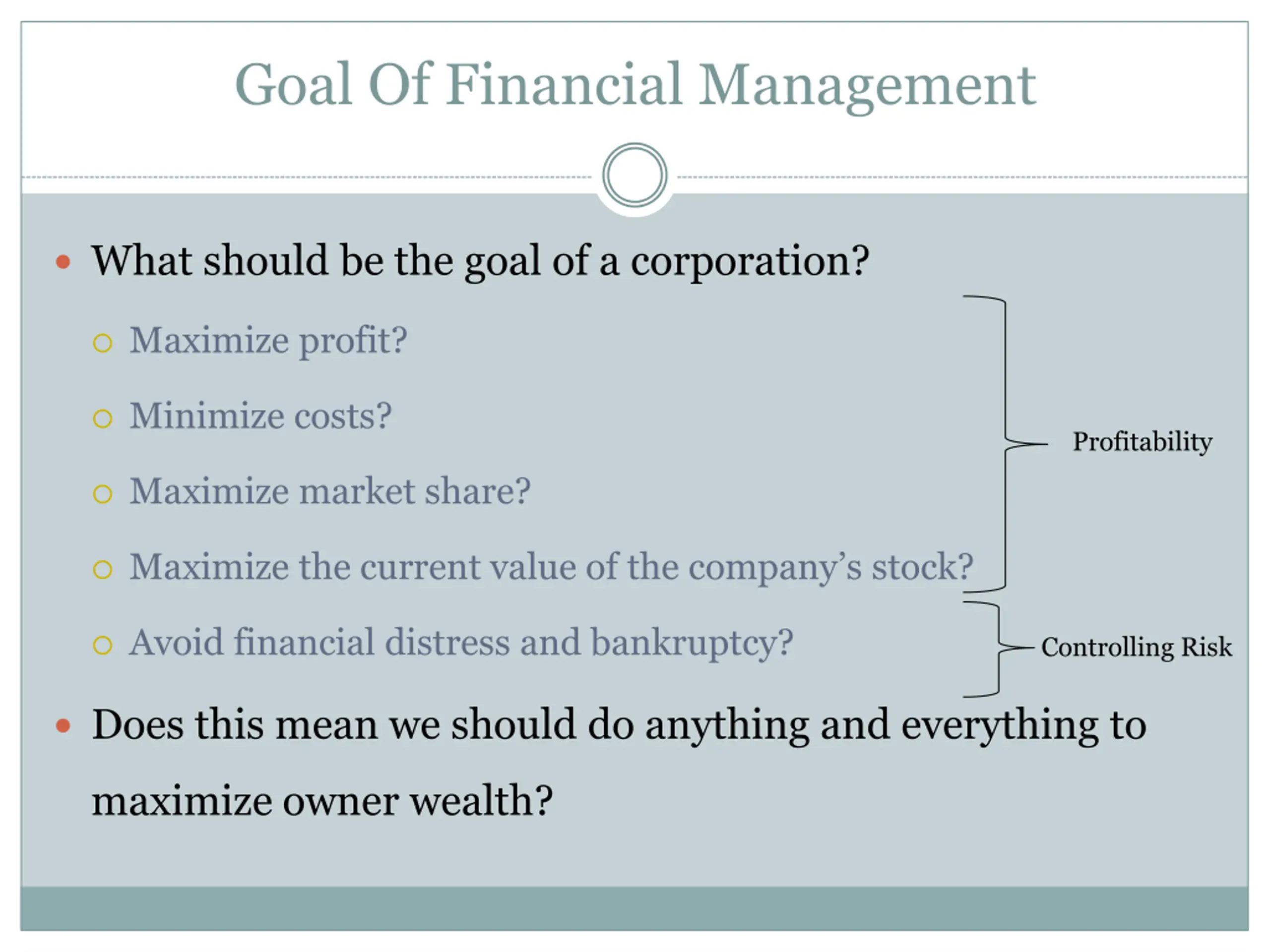Goal Of Financial Management What should be the goal of a corporation? Maximize profit? Minimize costs? Profitability Maximize market share? Maximize the current value of the company s stock? Avoid financial distress and bankruptcy? Controlling Risk Does this mean we should do anything and everything to maximize owner wealth?