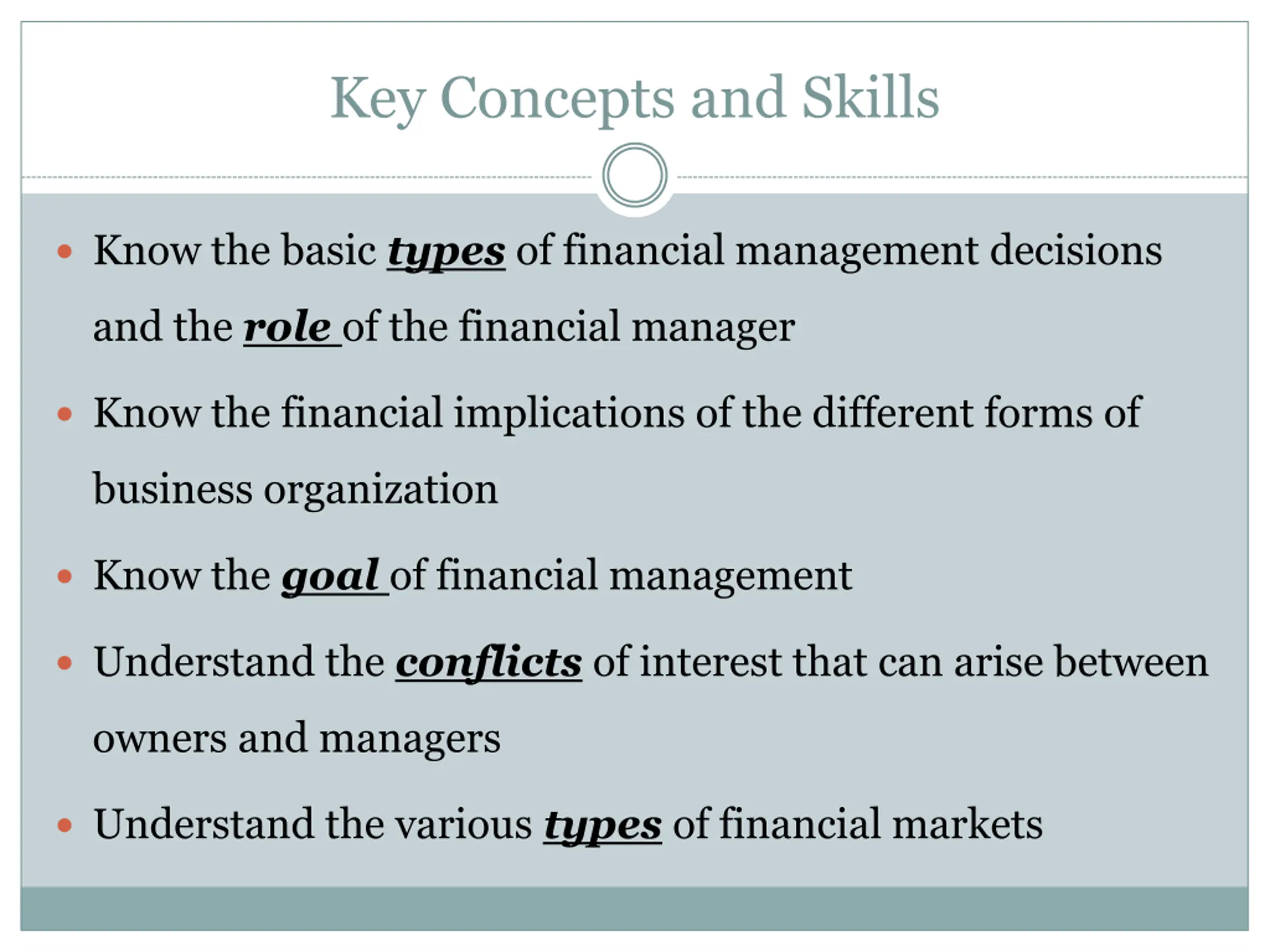 Key Concepts and Skills Know the basic types of financial management decisions and the role of the financial manager Know the financial implications of the different forms of business organization Know the goal of financial management Understand the conflicts of interest that can arise between owners and managers Understand the various types of financial markets