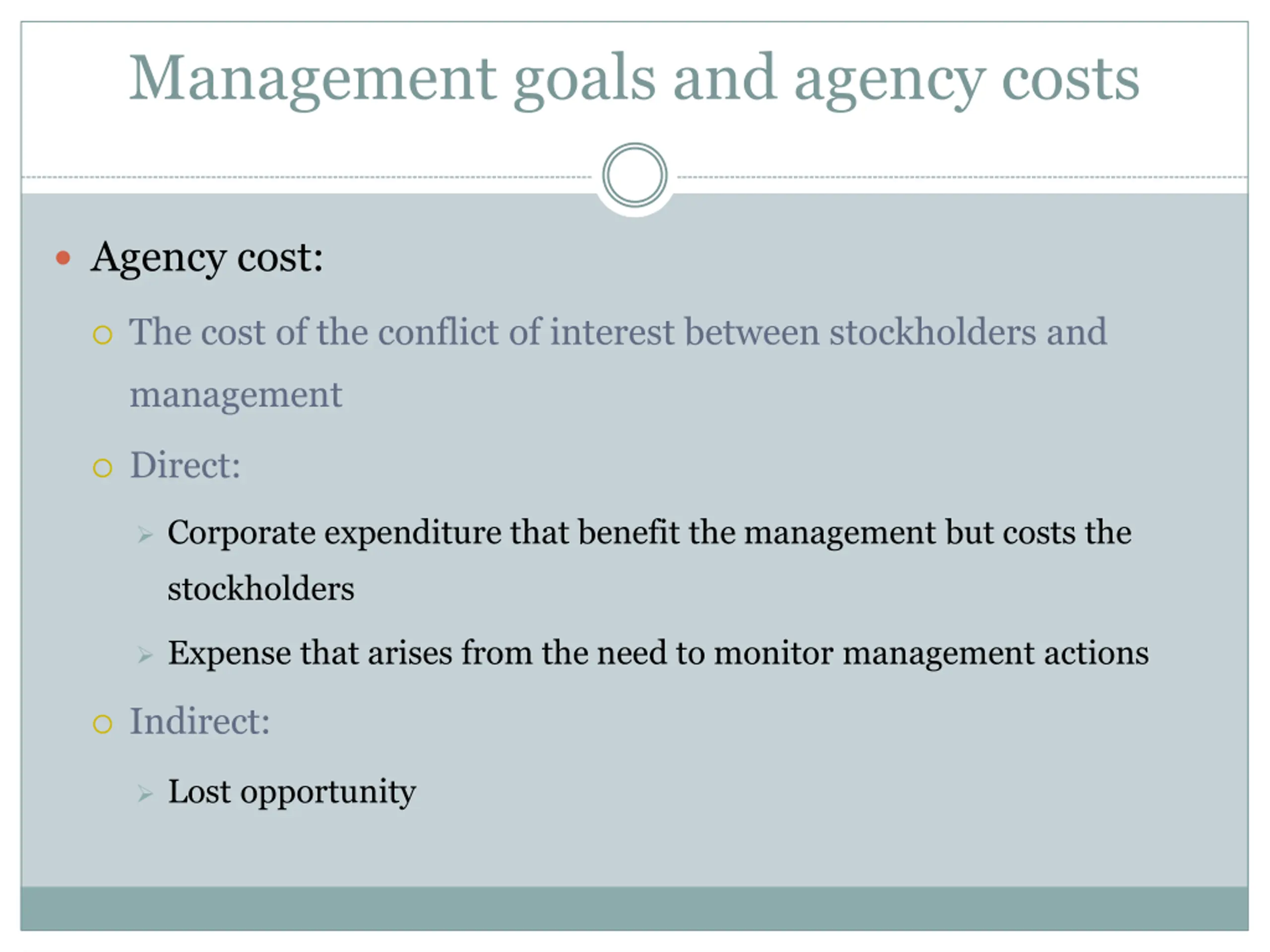 Management goals and agency costs Agency cost: The cost of the conflict of interest between stockholders and management Direct: Corporate expenditure that benefit the management but costs the stockholders Expense that arises from the need to monitor management actions Indirect: Lost opportunity