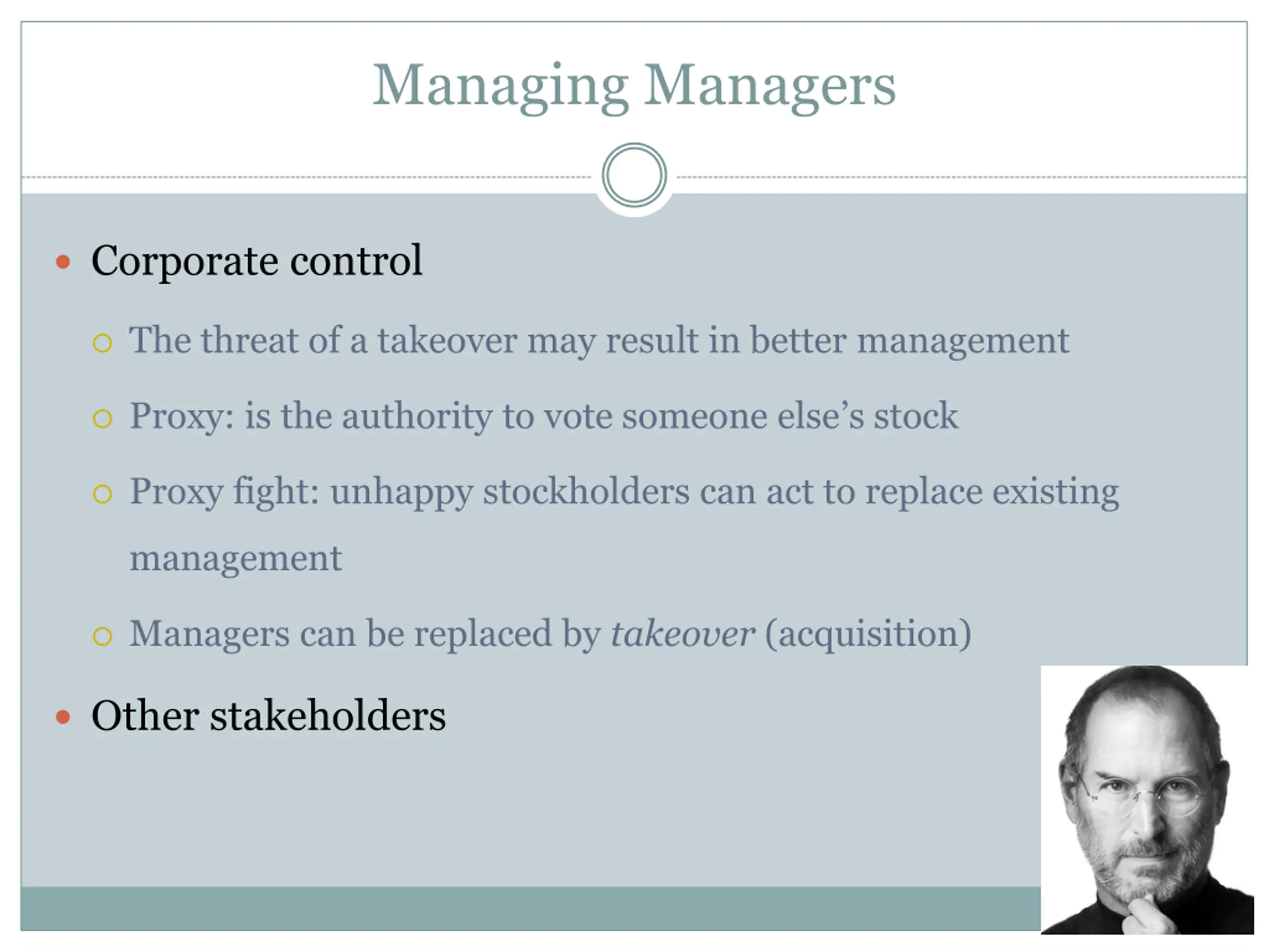 Managing Managers Corporate control The threat of a takeover may result in better management Proxy: is the authority to vote someone else s stock Proxy fight: unhappy stockholders can act to replace existing management Managers can be replaced by takeover (acquisition) Other stakeholders