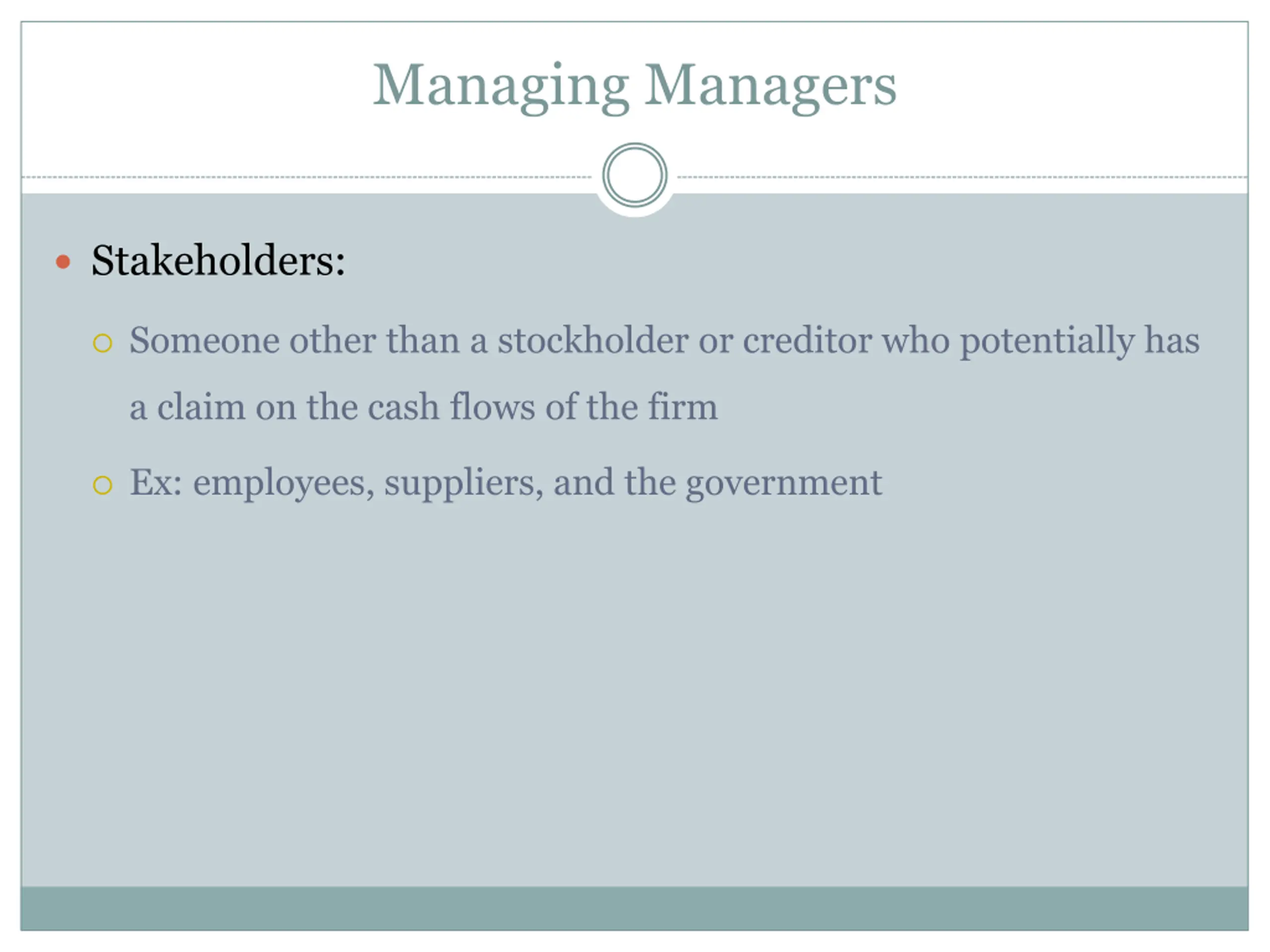 Managing Managers Stakeholders: Someone other than a stockholder or creditor who potentially has a claim on the cash flows of the firm Ex: employees, suppliers, and the government