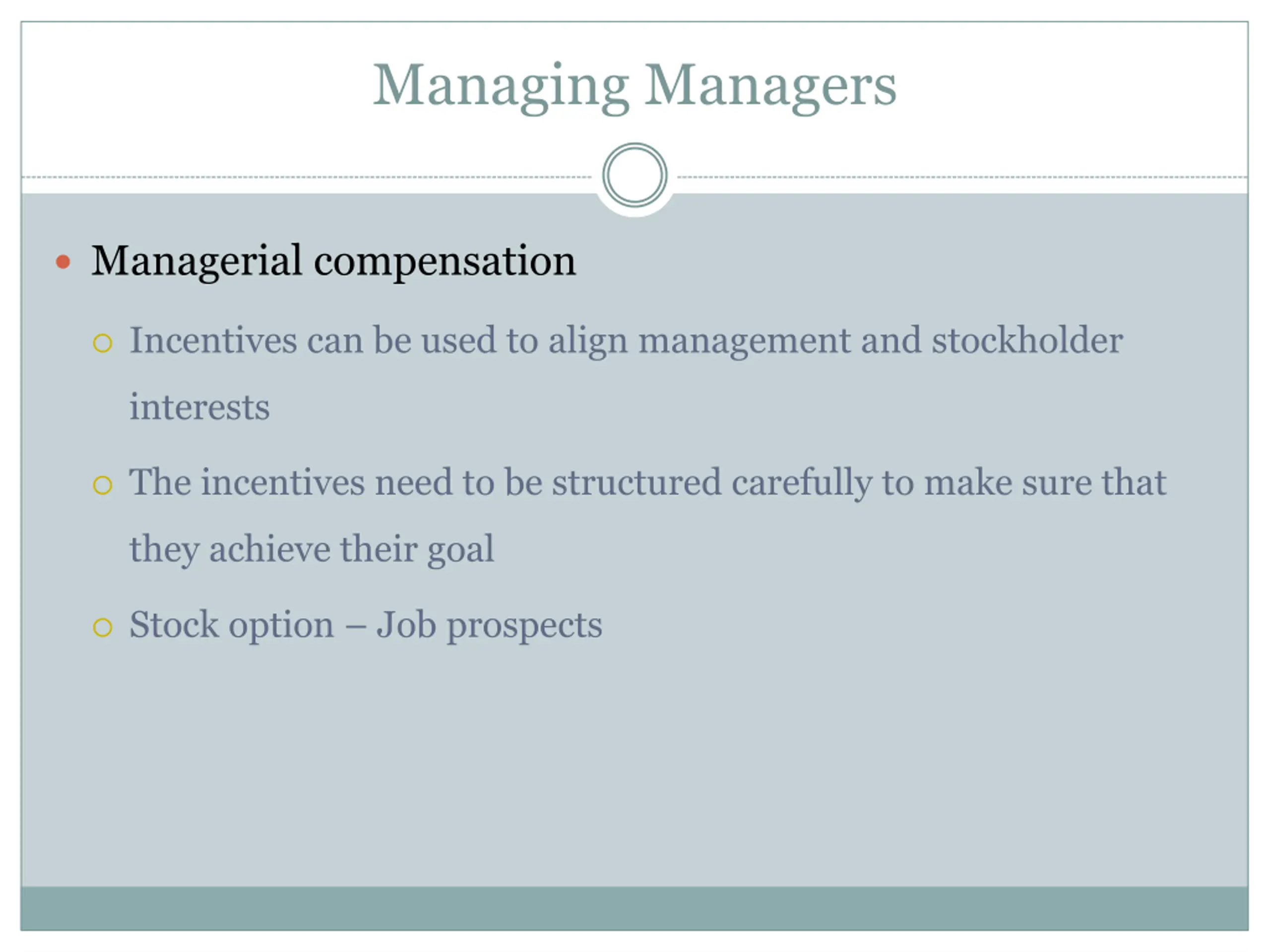 Managing Managers Managerial compensation Incentives can be used to align management and stockholder interests The incentives need to be structured carefully to make sure that they achieve their goal Stock option Job prospects