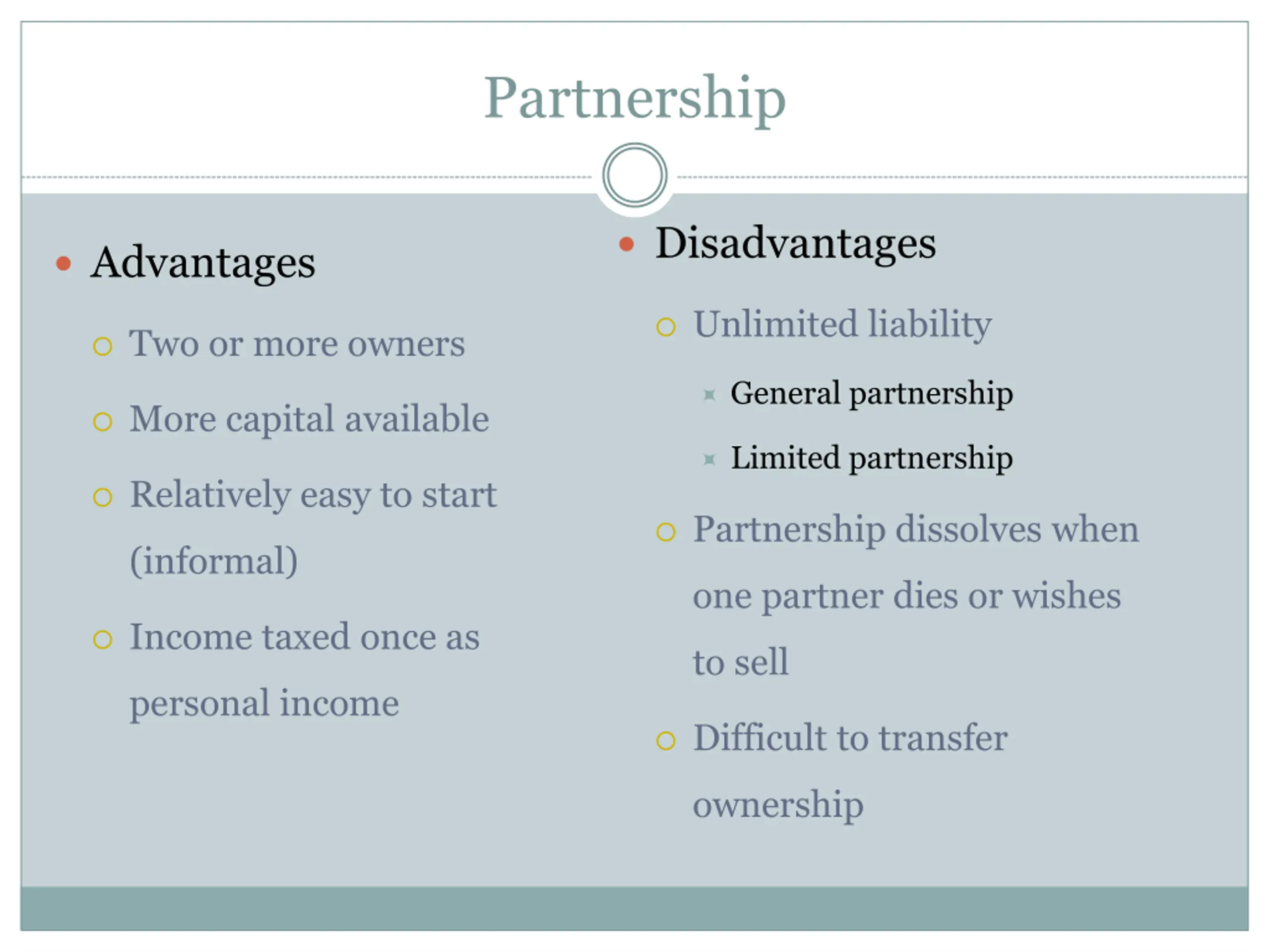 Partnership Disadvantages Advantages Unlimited liability Two or more owners General partnership More capital available Limited partnership Relatively easy to start Partnership dissolves when (informal) one partner dies or wishes Income taxed once as to sell personal income Difficult to transfer ownership