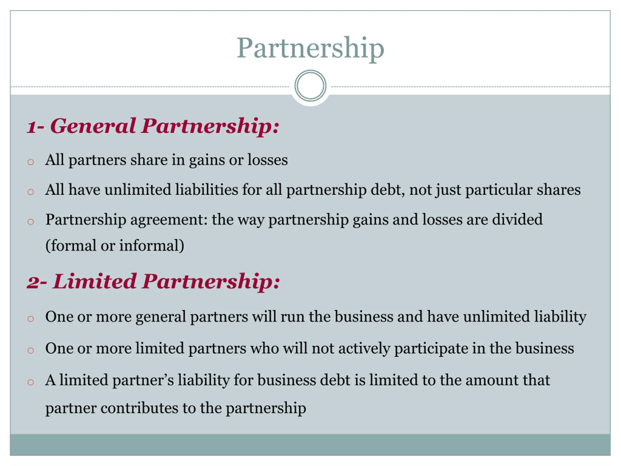 Partnership 1- General Partnership: o All partners share in gains or losses o All have unlimited liabilities for all partnership debt, not just particular shares o Partnership agreement: the way partnership gains and losses are divided (formal or informal) 2- Limited Partnership: o One or more general partners will run the business and have unlimited liability o One or more limited partners who will not actively participate in the business o A limited partner s liability for business debt is limited to the amount that partner contributes to the partnership