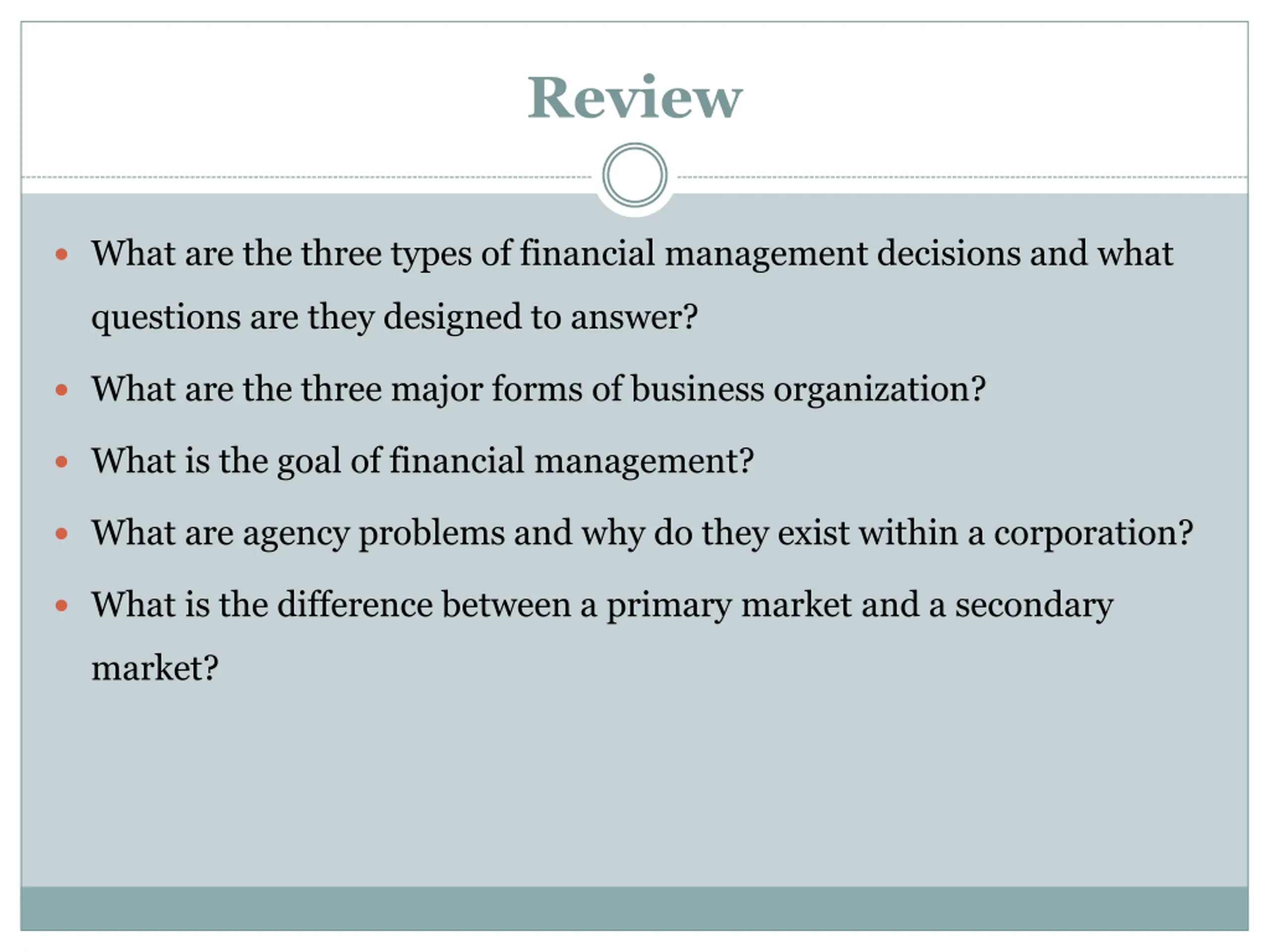 Review What are the three types of financial management decisions and what questions are they designed to answer? What are the three major forms of business organization? What is the goal of financial management? What are agency problems and why do they exist within a corporation? What is the difference between a primary market and a secondary market?
