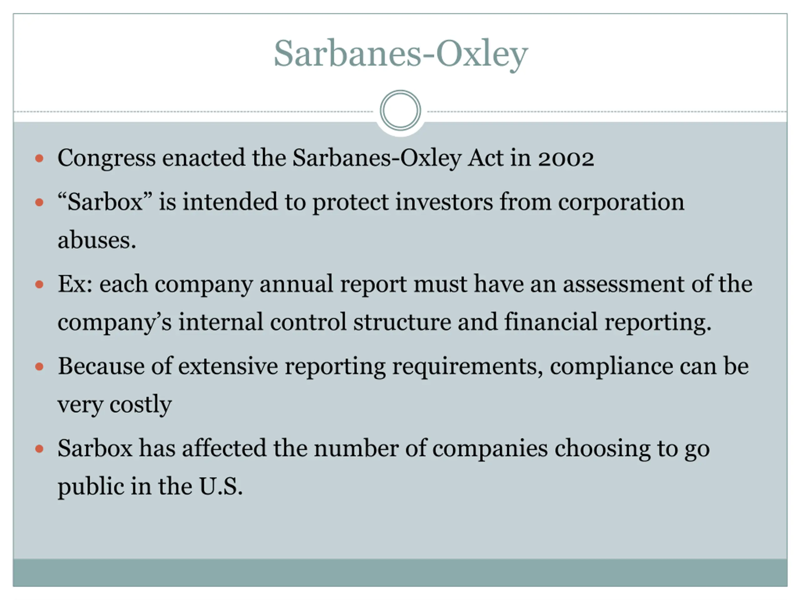 Sarbanes-Oxley Congress enacted the Sarbanes-Oxley Act in 2002 Sarbox is intended to protect investors from corporation abuses. Ex: each company annual report must have an assessment of the company s internal control structure and financial reporting. Because of extensive reporting requirements, compliance can be very costly Sarbox has affected the number of companies choosing to go public in the U.S.