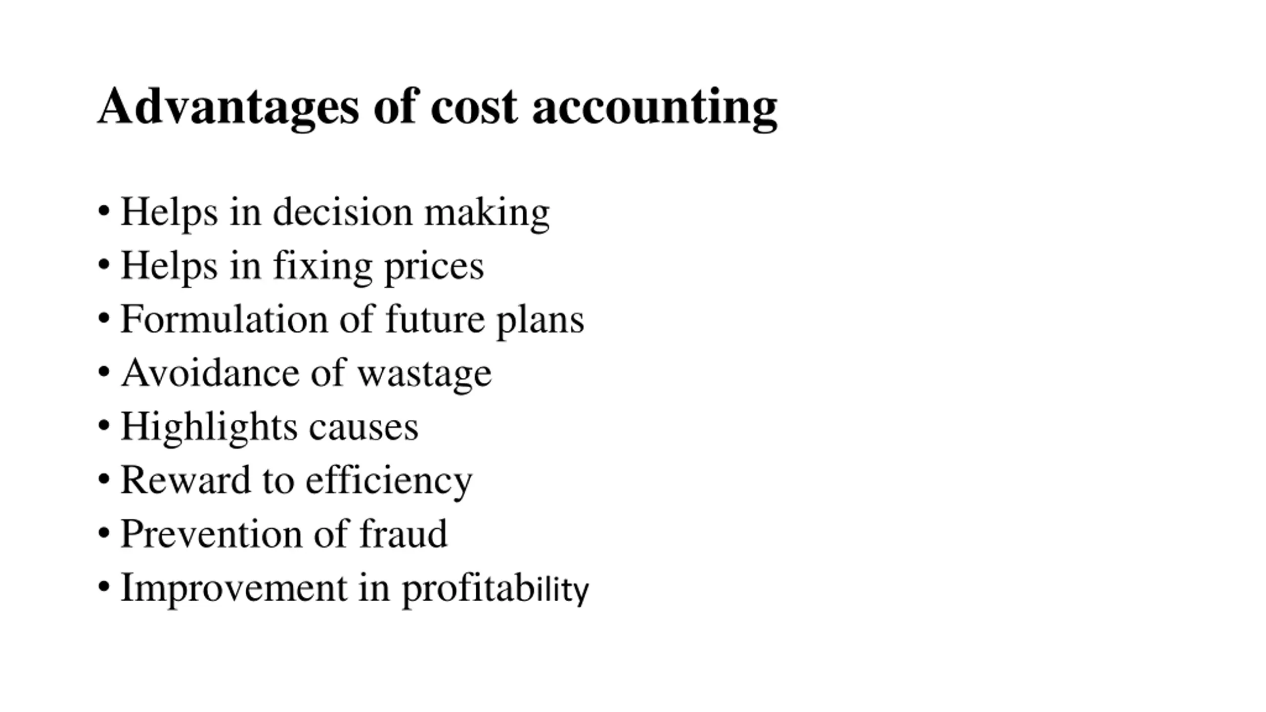 Advantages of cost accounting Helps in decision making Helps in fixing prices Formulation of future plans Avoidance of wastage Highlights causes Reward to efficiency Prevention of fraud Improvement in profitability